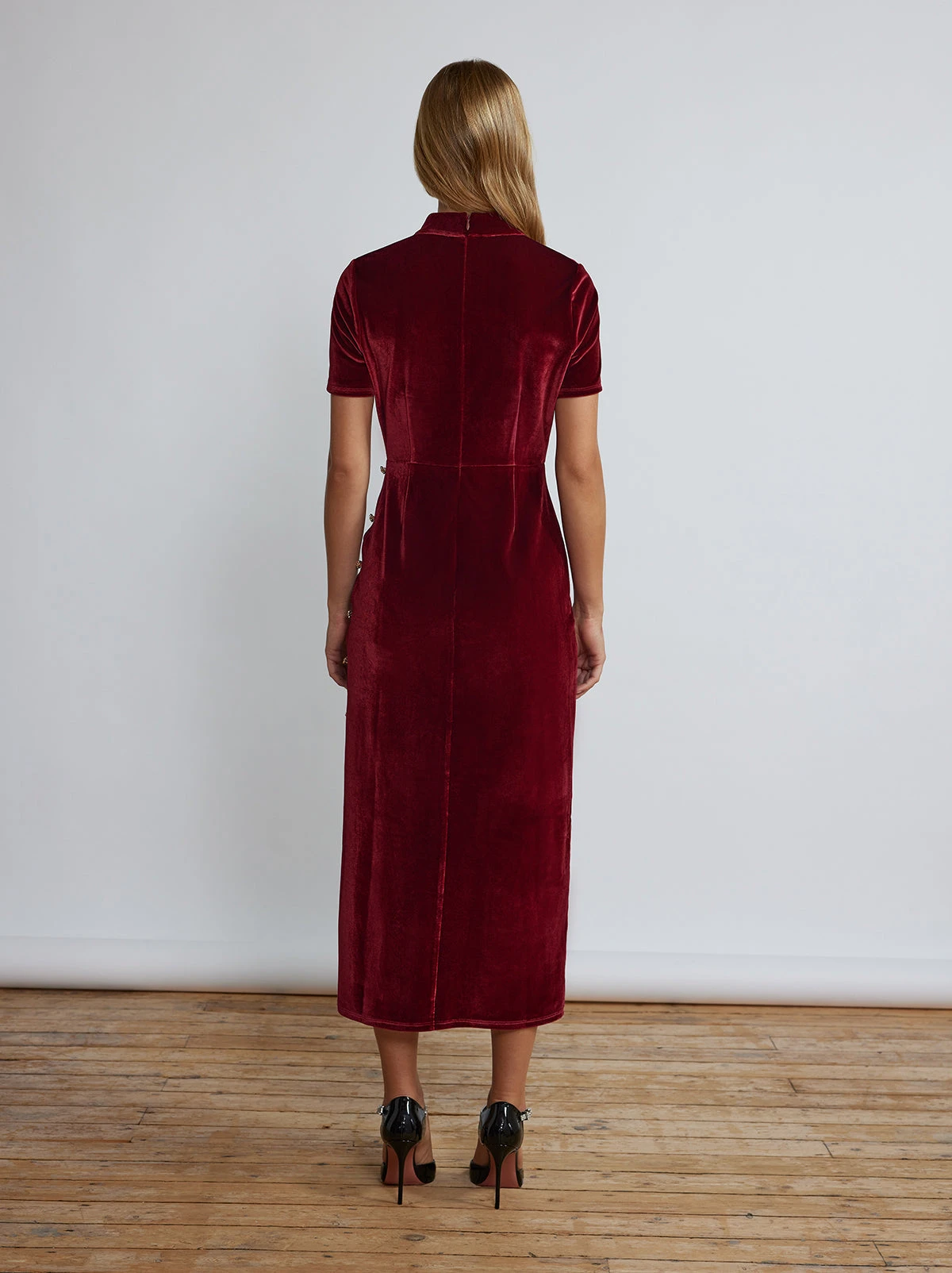 Winter is always better in velvet. Amanda is a fitted midi dress in sumptuous velvet with mock neck and slim skirt fastened with glittering gemstone summarys down the sides starting from top of the thigh.