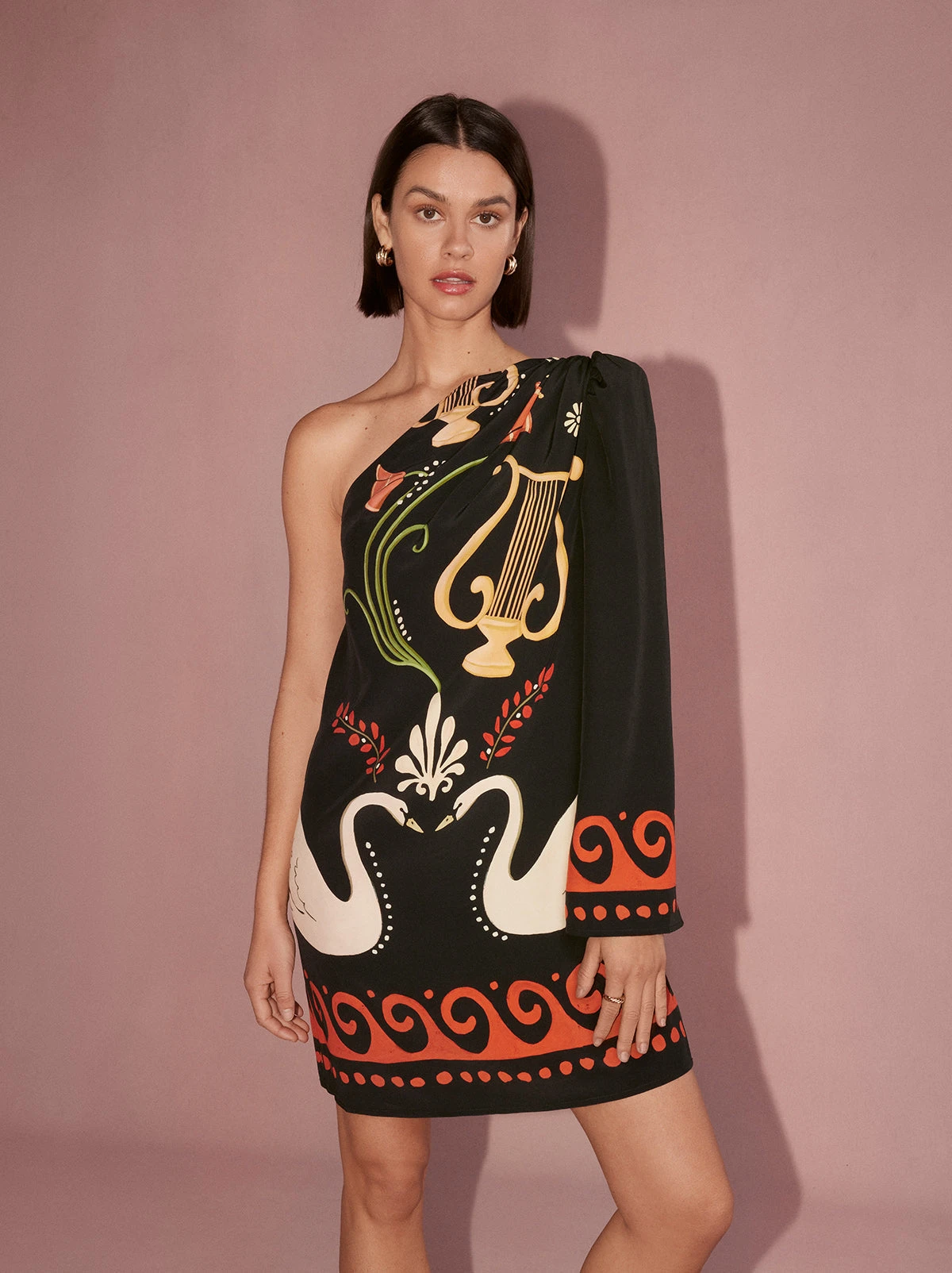 Some dresses demand attention and Antonia does just that. This one-shoulder wonder is inspired in both silhouette and print by ancient Grecian fashion and flora. Pair her with sandals during the day and switch up with barely-there heels at night.