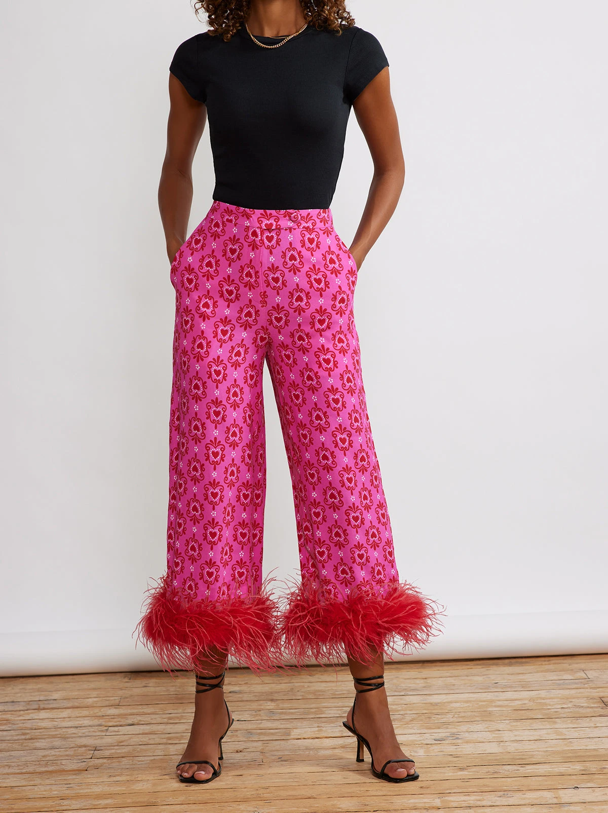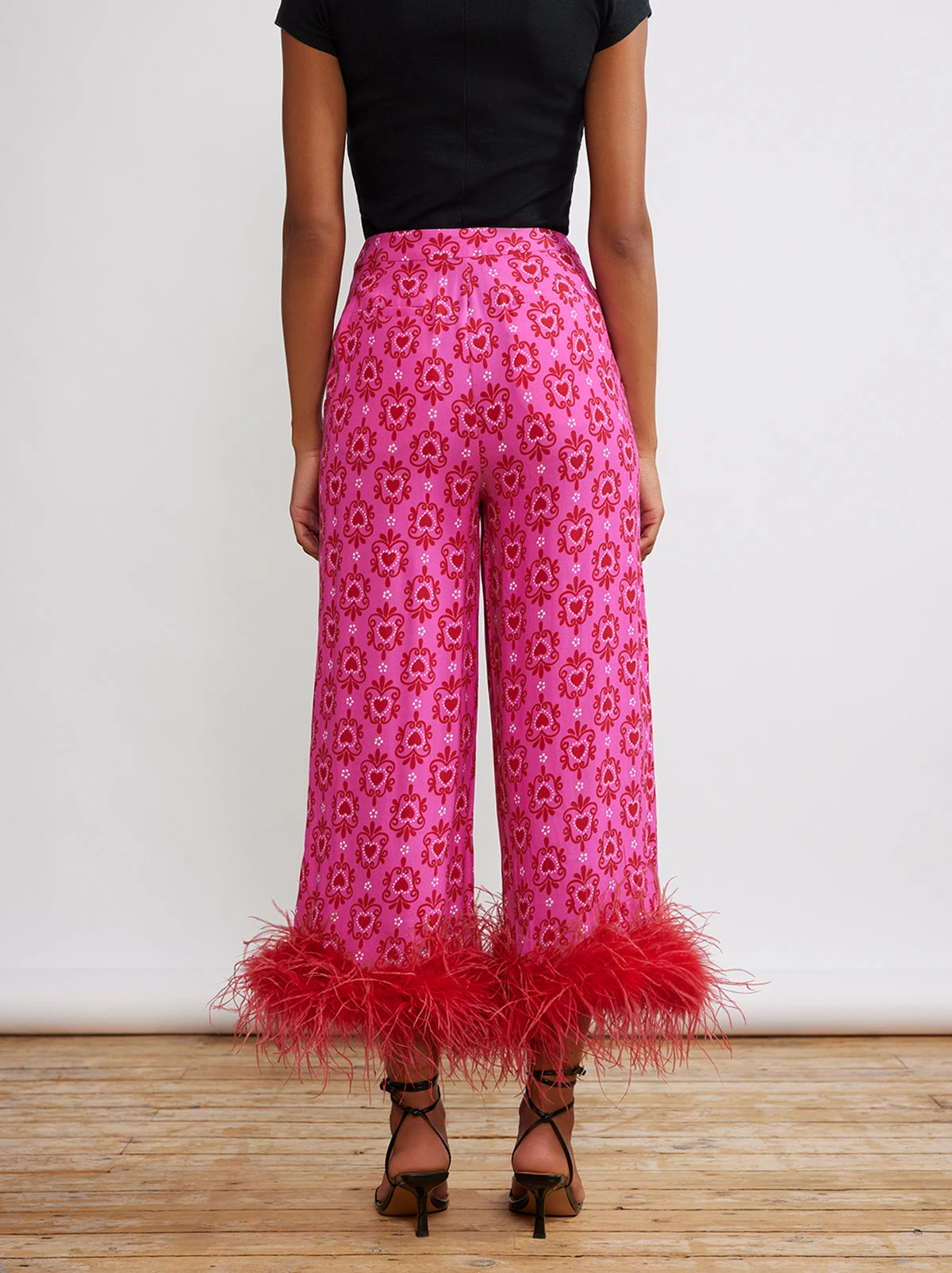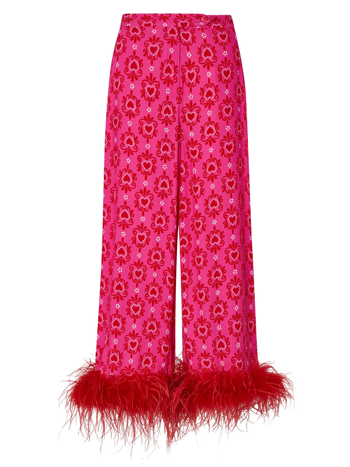 Party PJs? We’re in. Our bestselling feather hem pyjama trousers are back. Apollo has wide, cropped legs for smooth movement. She boasts a party-ready viscose satin fabrication in our new retro-inspired heart print, topped off with red feather trims.