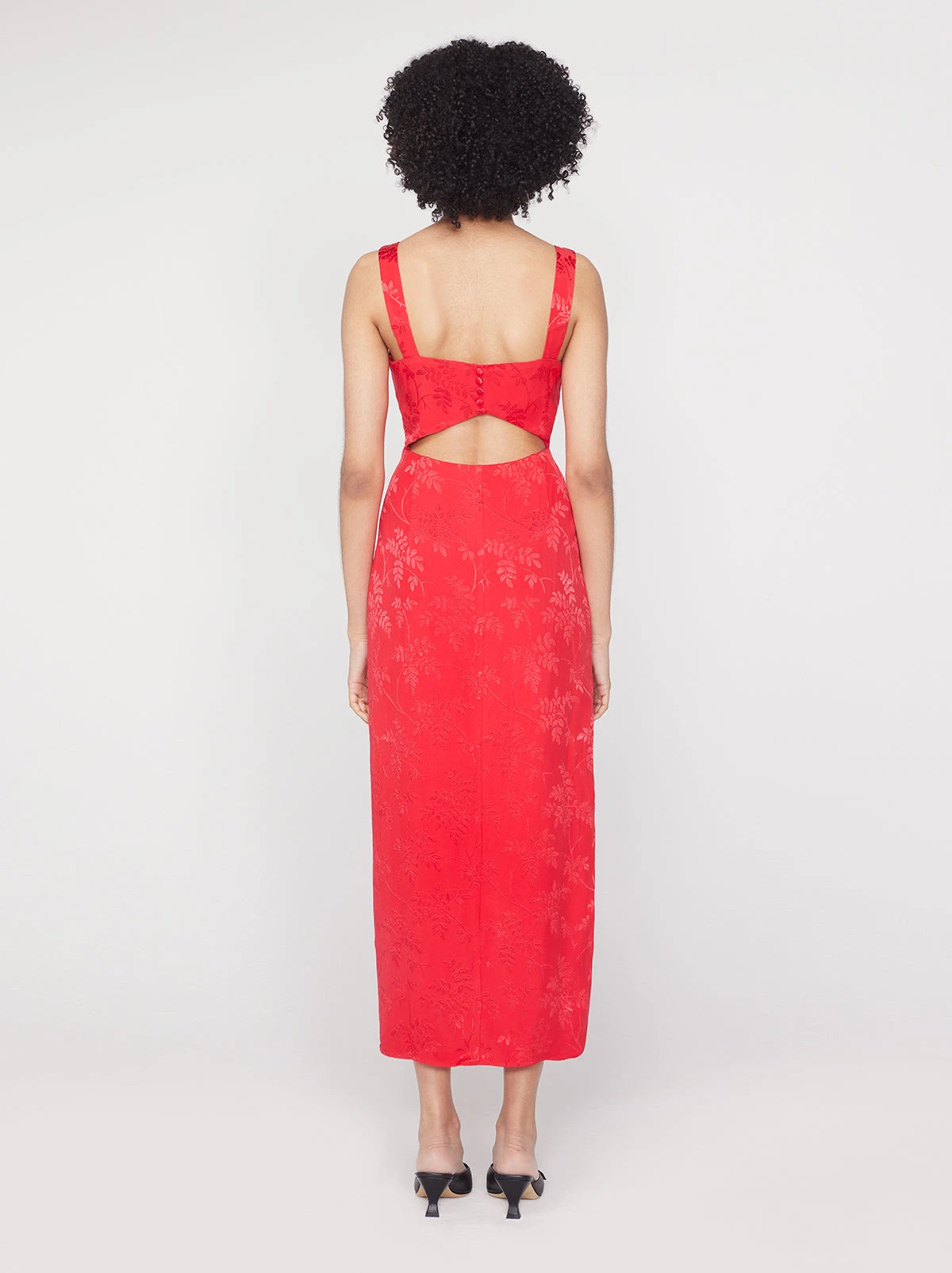 Quelle surprise! Aretha is a sultry midi dress cut from Watermelon jacquard for a luxurious feel and fit. Her square neckline, slim straps and column silhouette are countered by a playful back cutout for an unexpected twist.