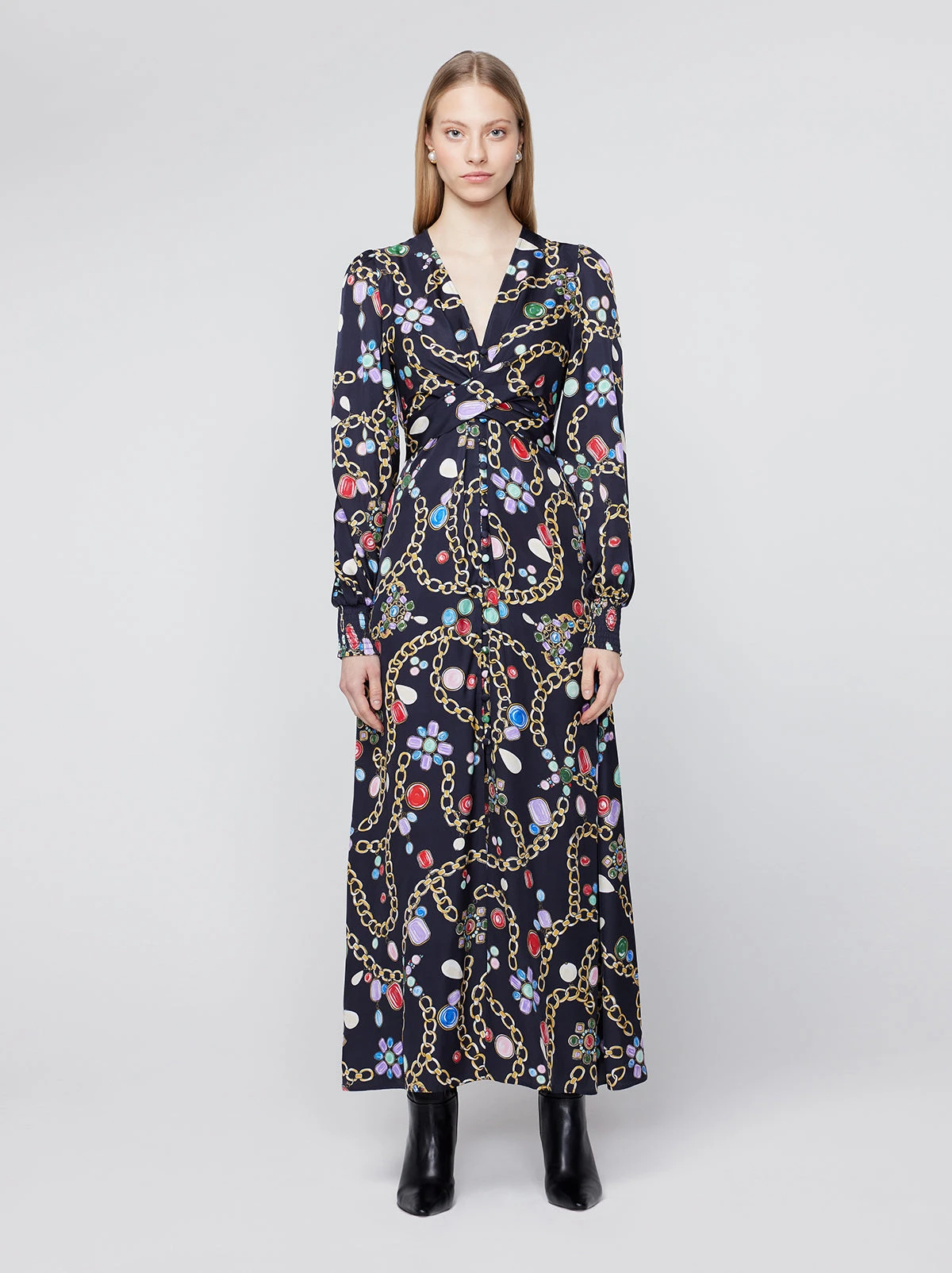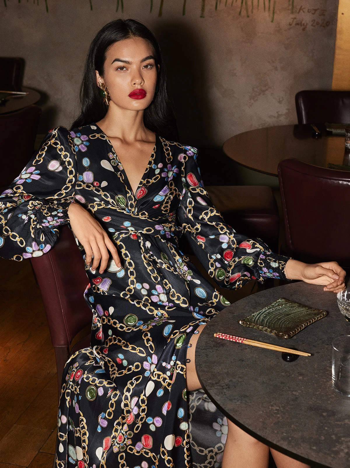 All about Aurora. The ultimate event piece, she features our ’90s runway-inspired Black Chain print for extra glamour. Flattering wrap-around waist and volume sleeves give her a retro look and feel.