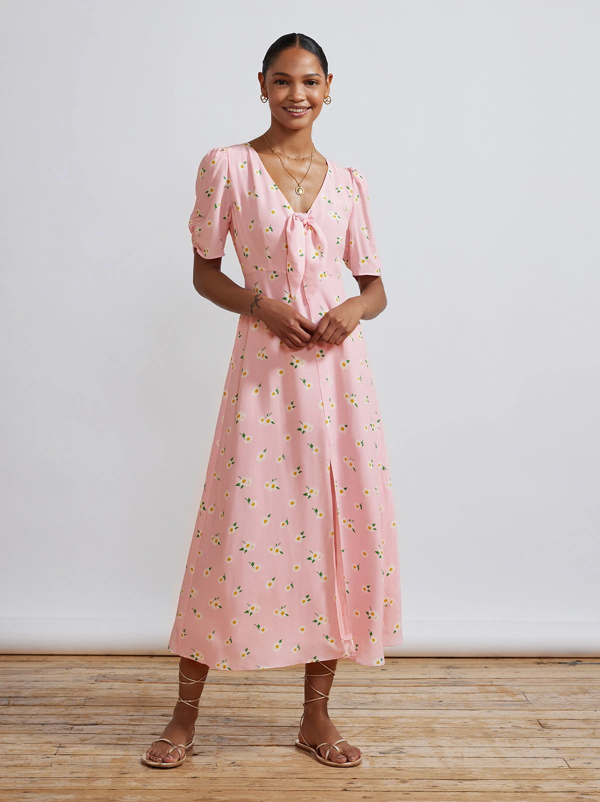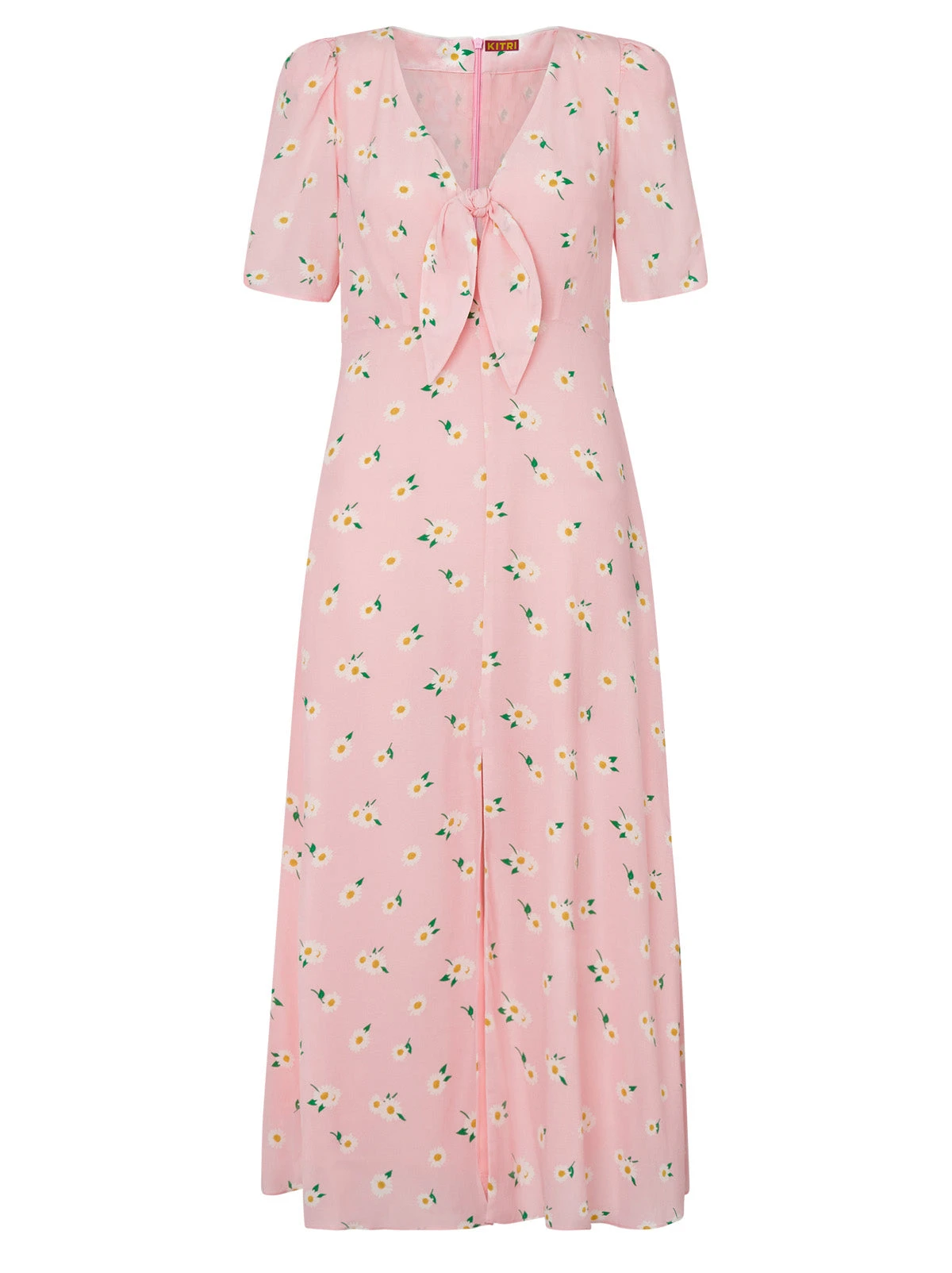 Crafted from lightweight viscose crepe fabrication printed with vintage-inspired pink daisies, this fully lined beauty has a deep v-neck and sweet bunny ear ties at the neckline so you can adjust the fit to your liking. We’ve added a centre-front split on the flared skirt for a little extra drama.