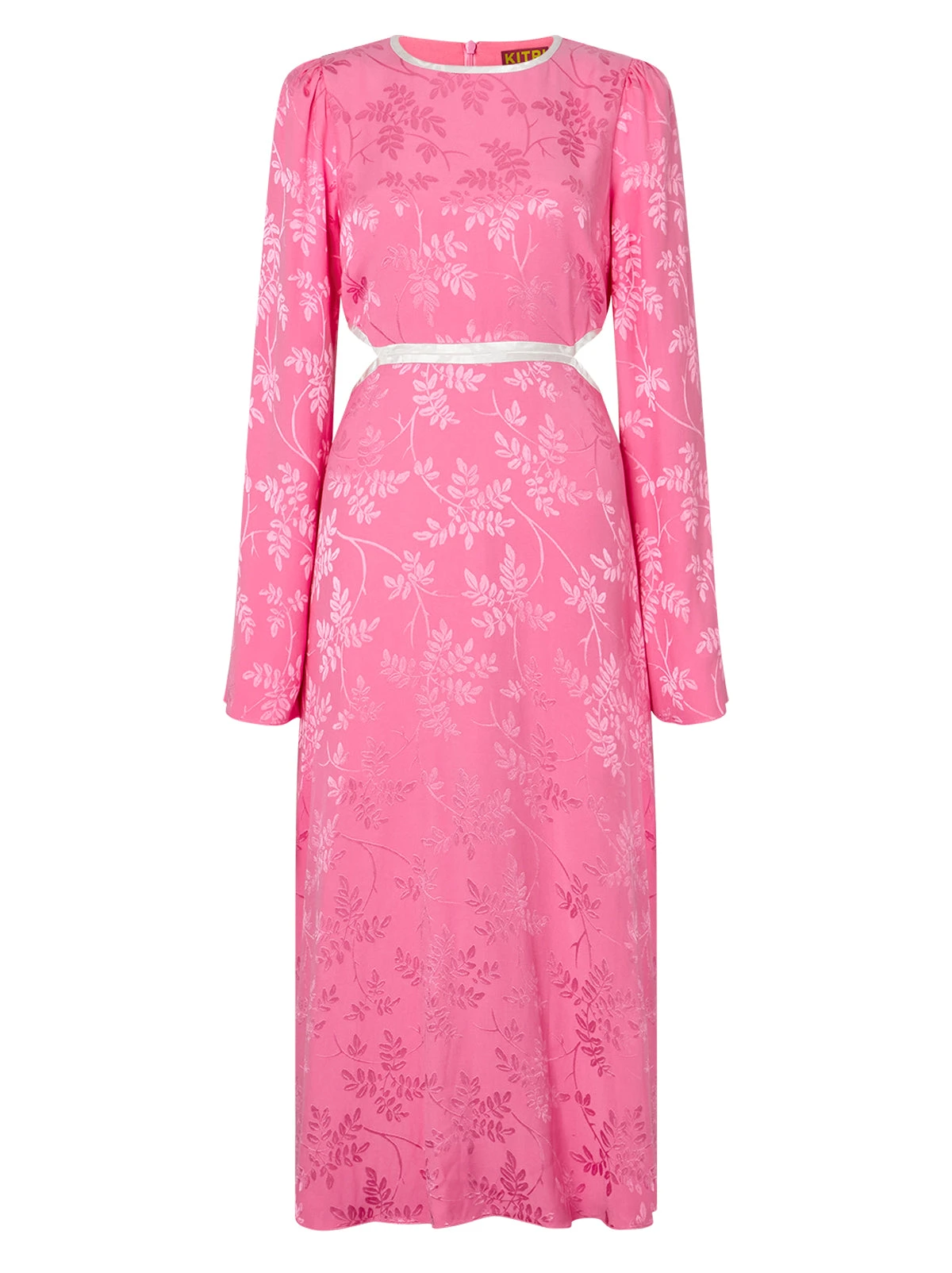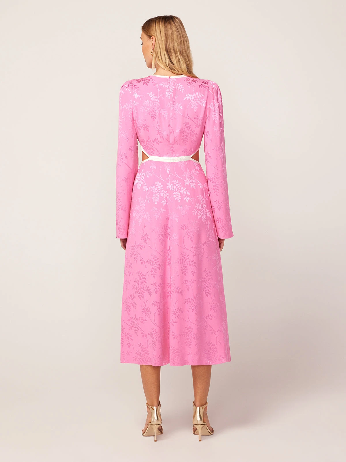 Pretty in pink. Blythe’s scoop neck and flirtatious cutouts are tempered by a voluminous flared skirt and sleeves. Her jacquard texture and contrast trims adds dimension to this showstopping midi dress.