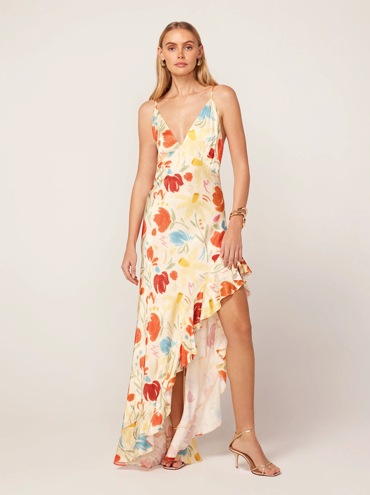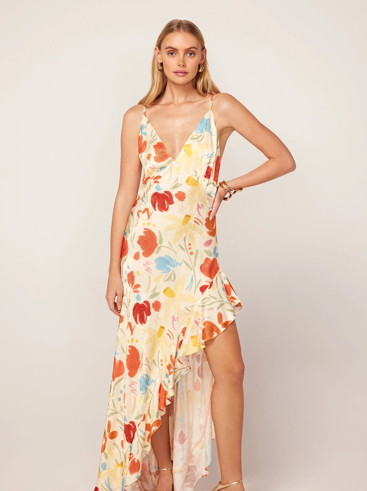 She’s a floor-sweeper. Brigitte’s plunging neckline and asymmetric waterfall ruffle hem make her the best dress for any summer rendezvous or soirée. Her exquisite jacquard fabrication adds a subtle shimmer and texture to the dress that’s sure to make an impression. Inspired by the flora of ancient Greece, prepare to bloom in Brigitte.