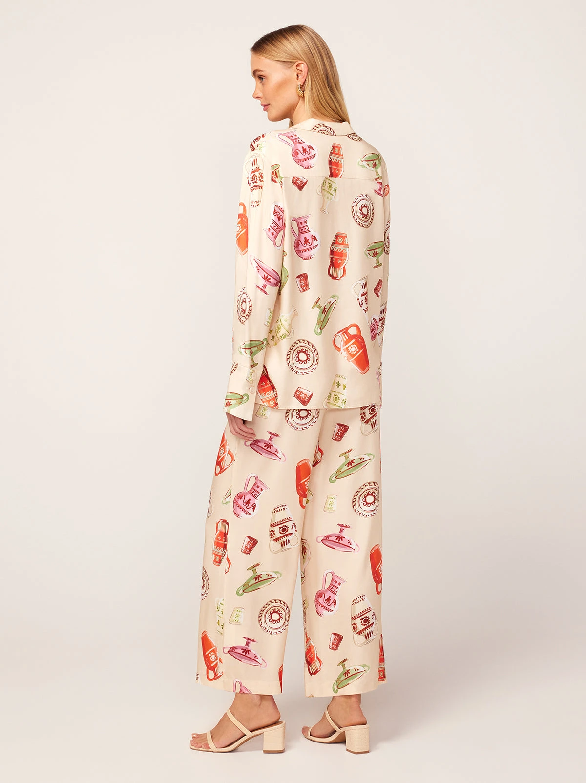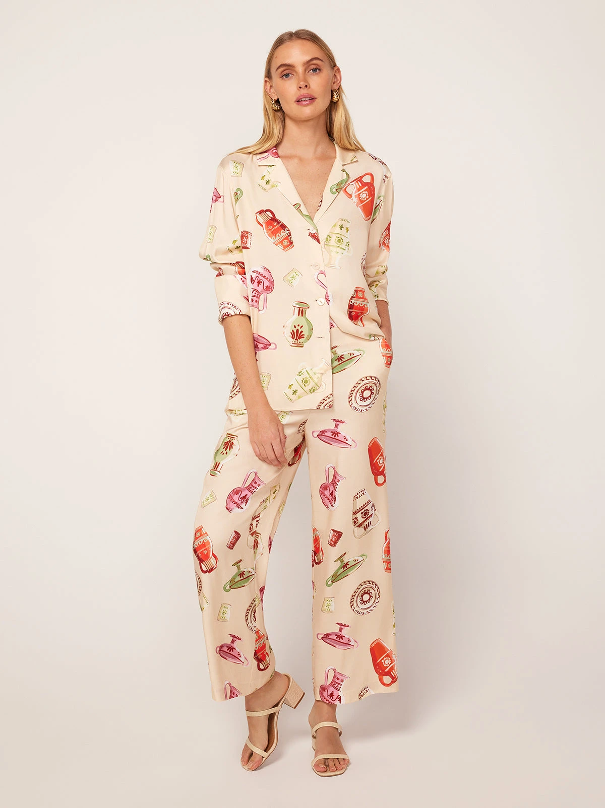 The epitome of easy elegance. Look no further than our Cady shirt in our hand-painted Pottery Print. Cut from silky Ecovero/viscose satin fabrication in a comfortable oversized fit with a notched collar, Cady is the ultimate day-to-night piece. Pair with our Romina Ivory Pottery Print Trousers for the ultimate co-ord.