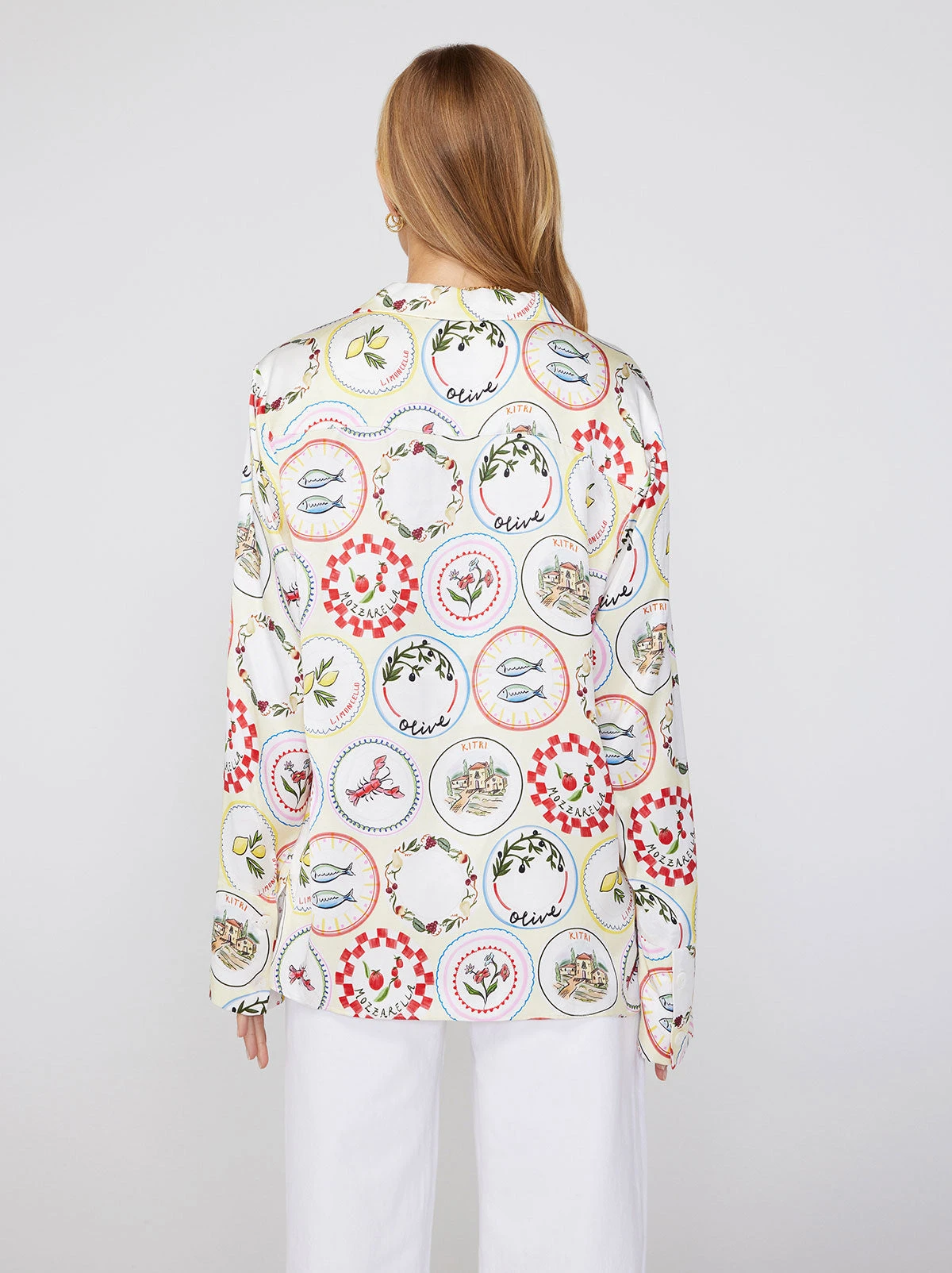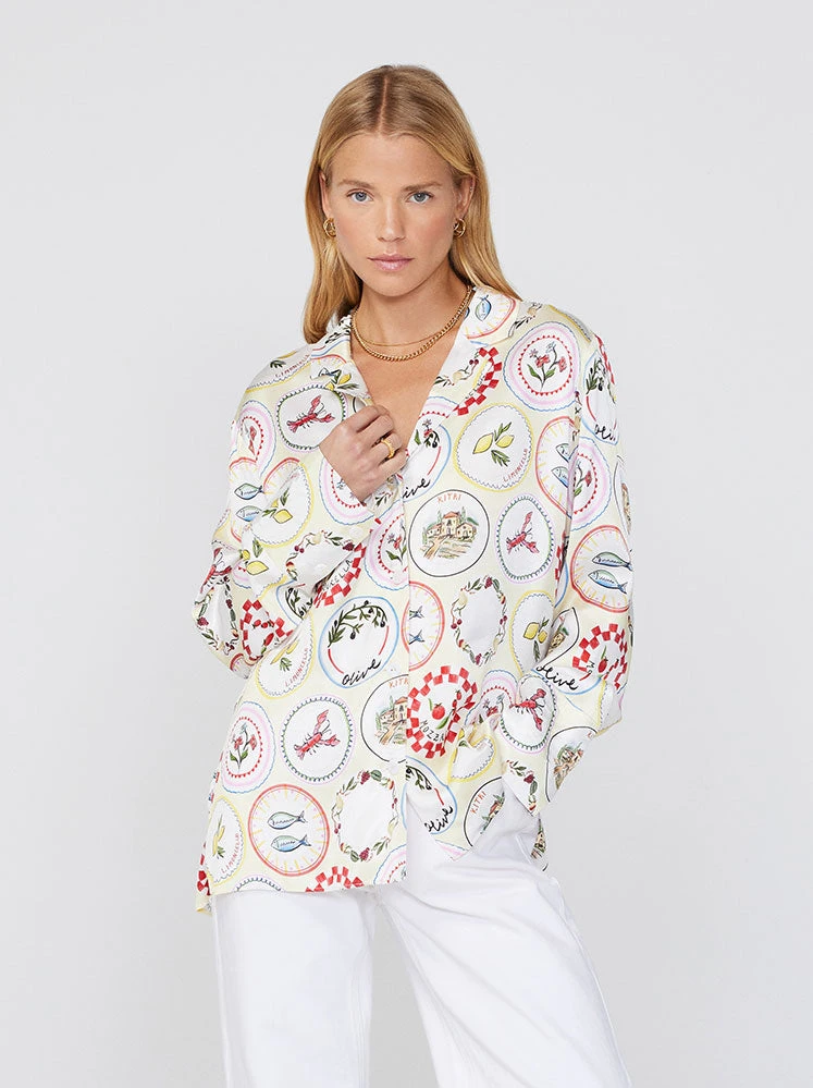 Looking for a top with a certain je ne sais quoi? Look no further than our Cady shirt in our hand-painted Vintage Plates print. Cut from silky Ecovero/viscose satin fabrication in a comfortable oversized fit with a notched collar, Cady is the ultimate day-to-night piece. Pair with denim for a casual dinner or matching Romina Vintage Plates Trousers for the ultimate party look.