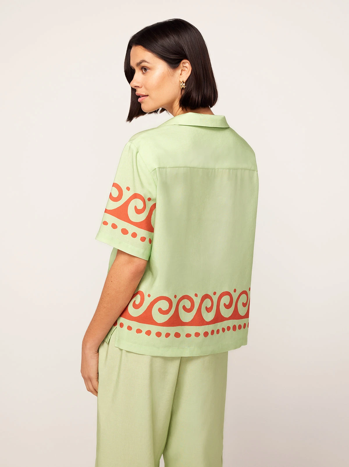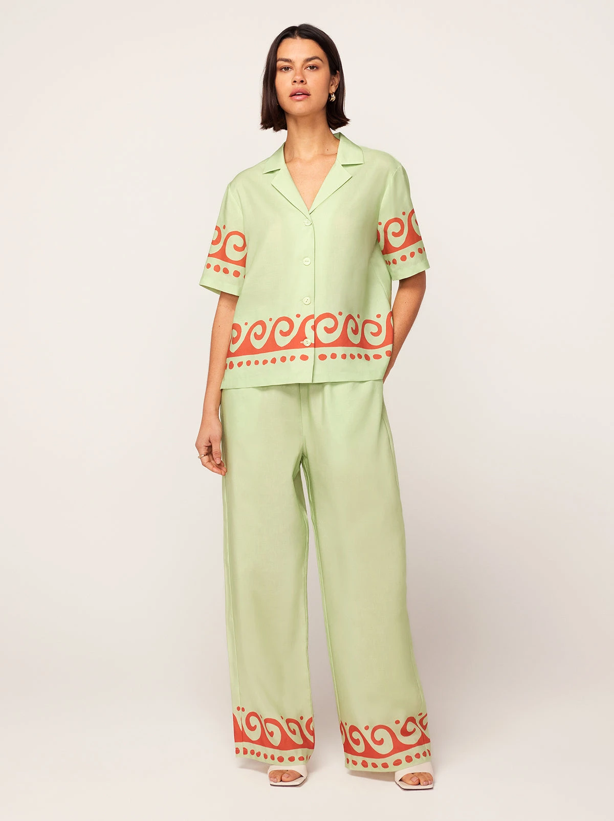 Breeze through summer in Cammy, a retro-inspired bowling shirt of our dreams in a breezy linen fabrication. Featuring notched collar detail with a casual boxy fit in a Pistachio green hue, Cammy is great when paired with co-ordinating Agatha Pistachio Wave Print Trousers.