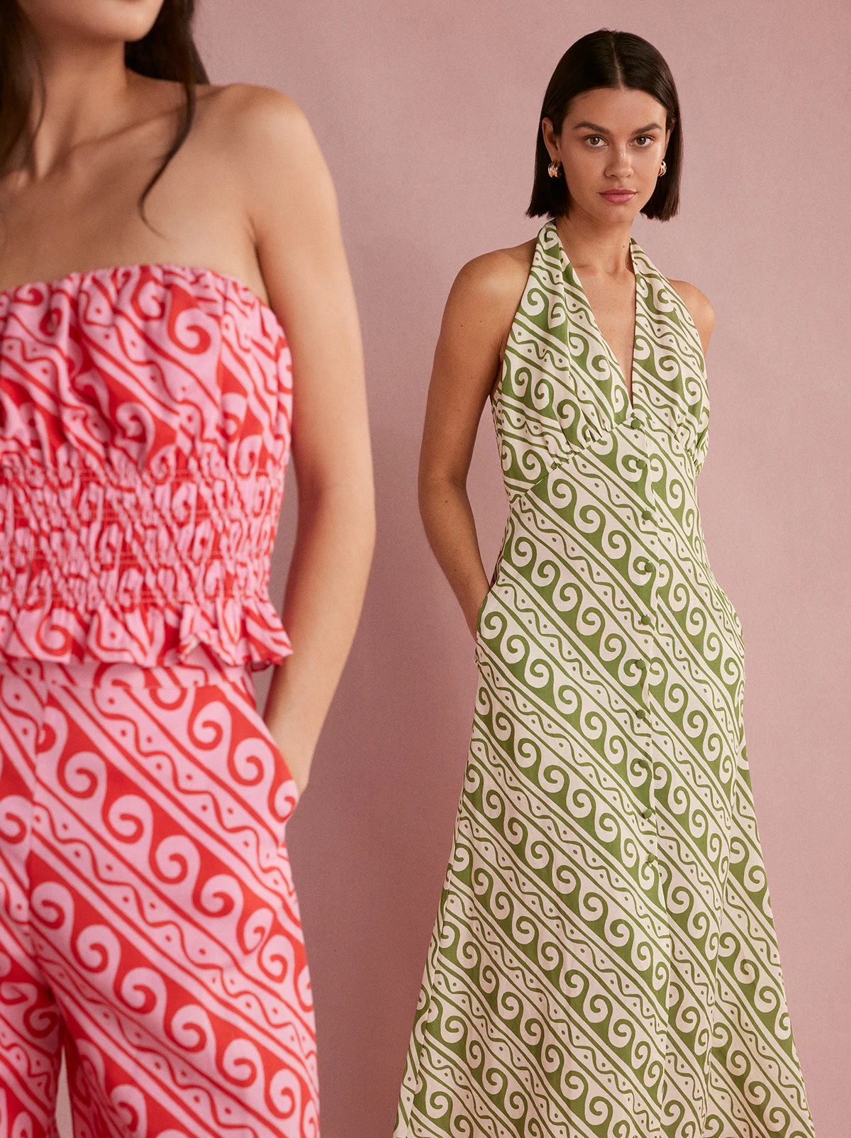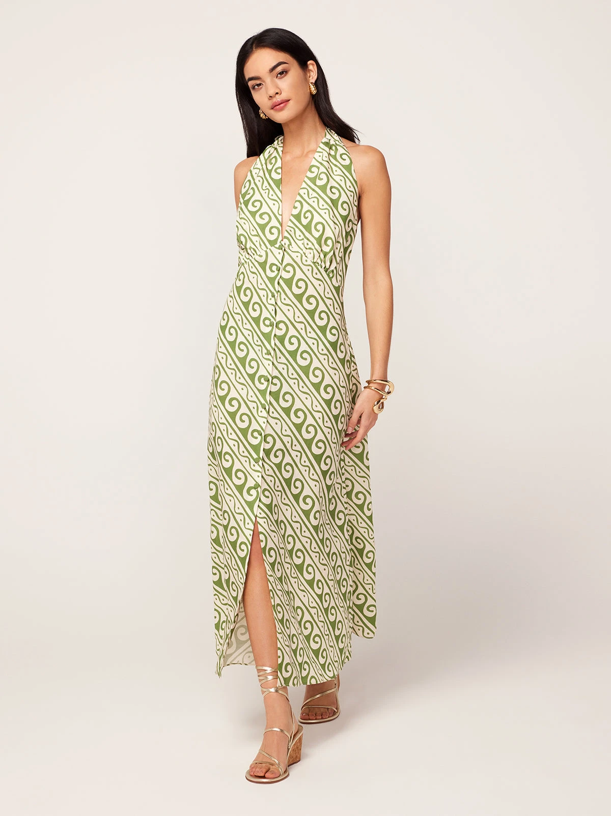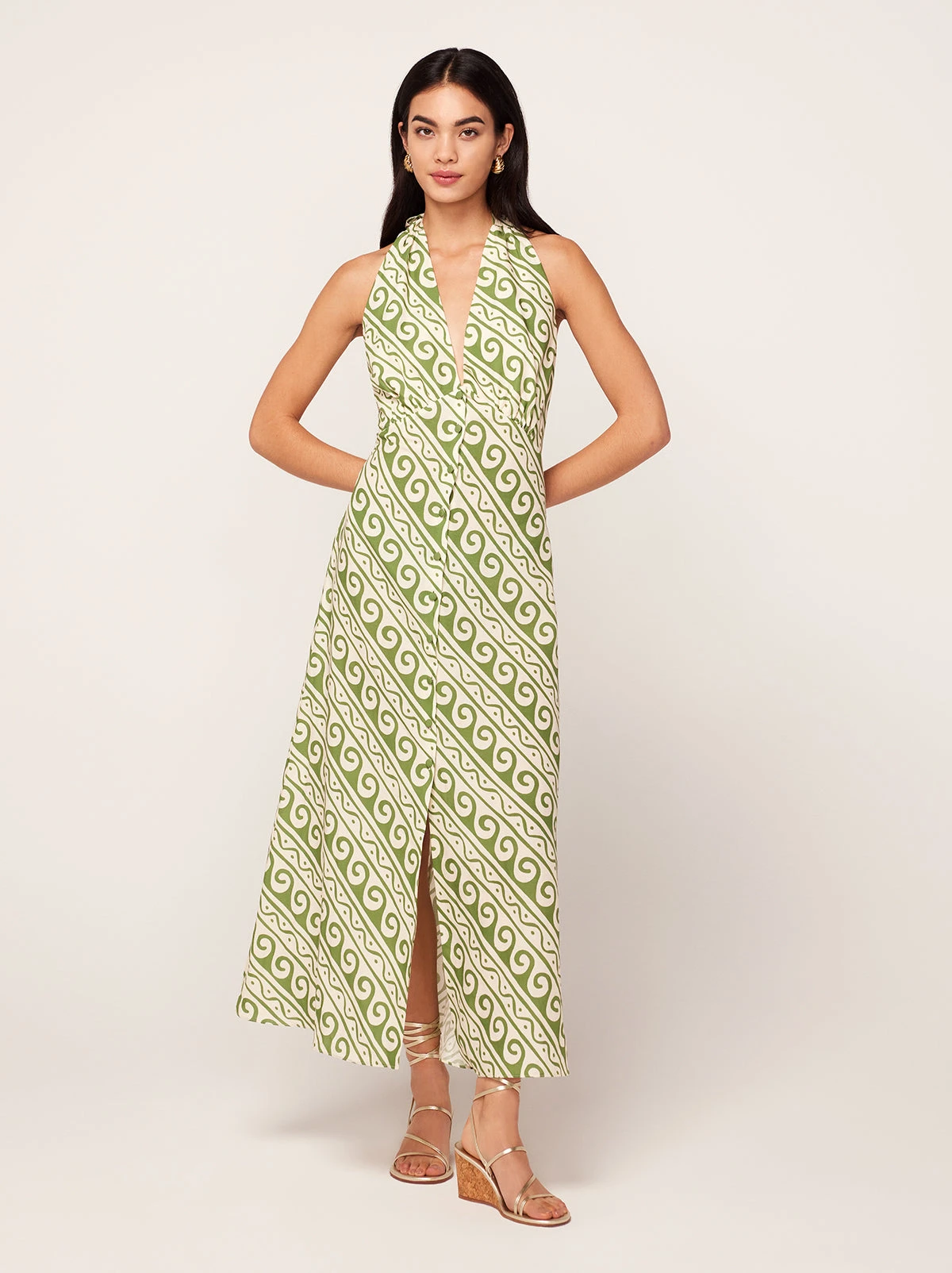 We’re channeling Rachel Green’s ‘honeymoon’ to Athens. Claudia’s a ’90s-inspired halterneck dress with a tie back and ruching under the bust for a comfortable, easy fit. She’d look great with sandals by the beach or with a pair of heels for a summer wedding.