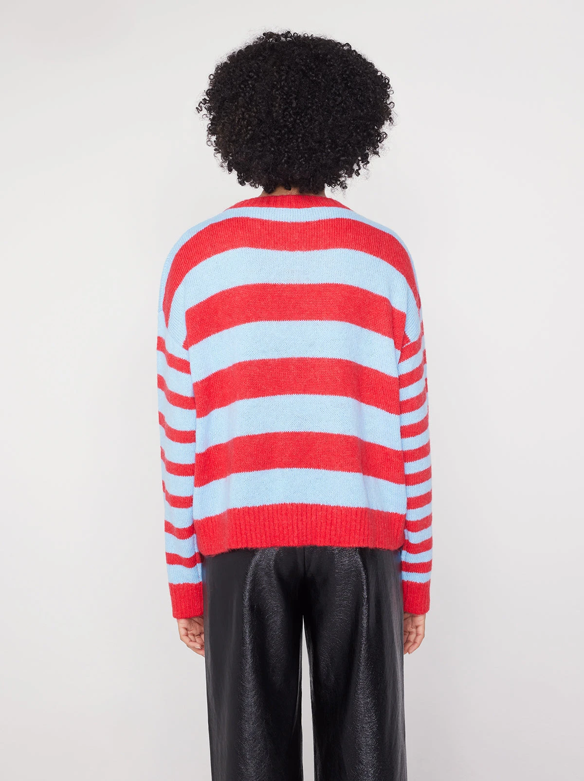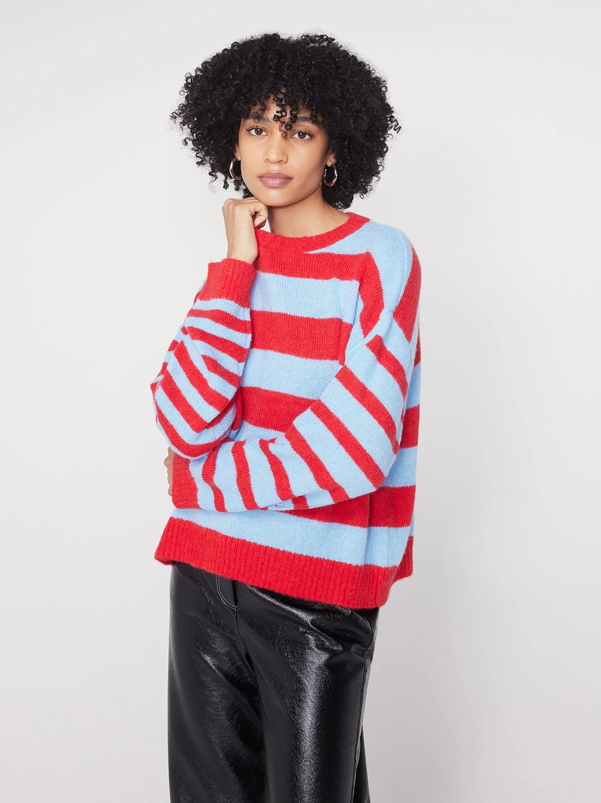 Rom-com core. Keep things cosy with Darina, a contemporary, oversized sweater with a round neck in a watermelon and pale blue stripe sweater. Crafted from an Alpaca wool blend, you just know she’s as soft as she looks.