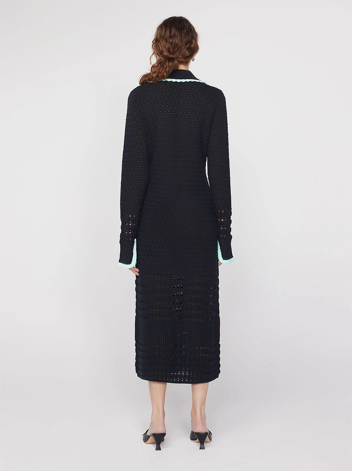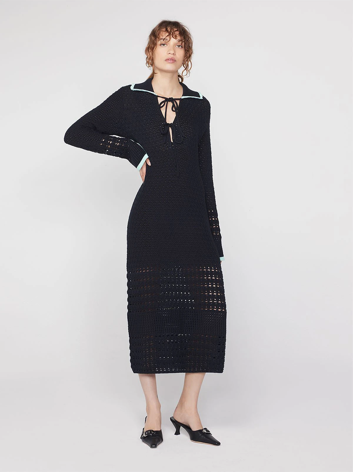 Let’s get cosy. Delilah is a crochet midi dress, perfect to transition between the seasons. Her openwork panelling and contrast mint tipping on collars and cuffs lift the neutral, versatile black base.