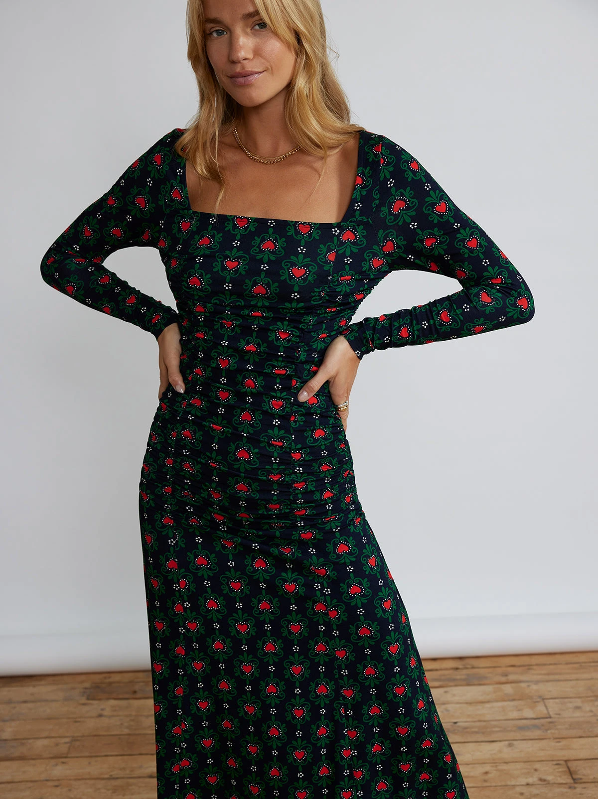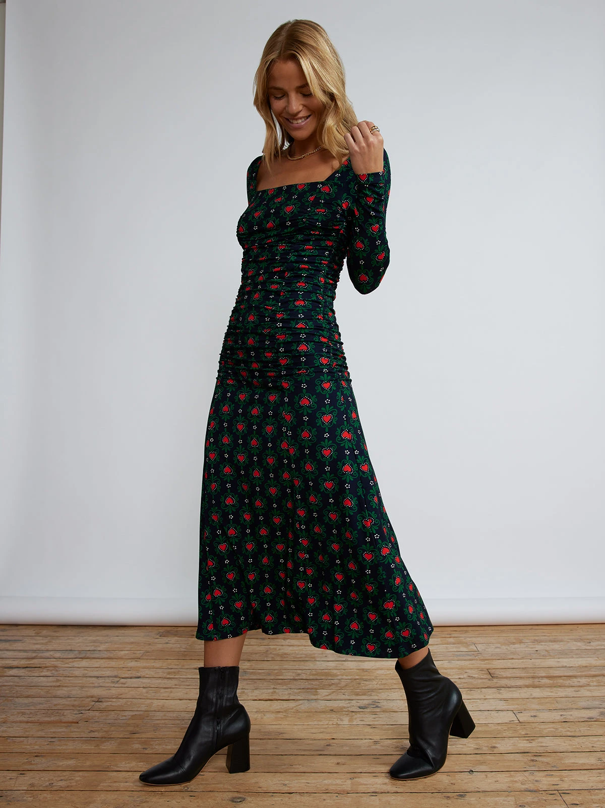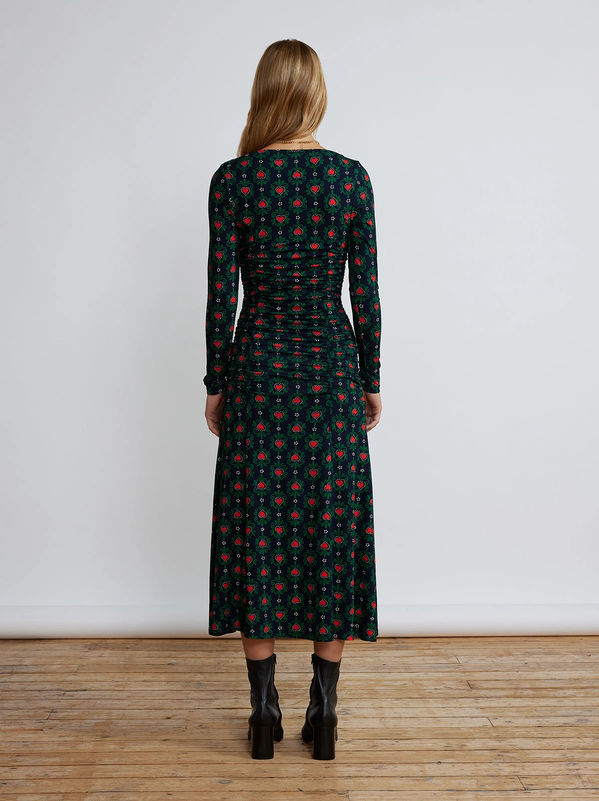You can rely on Diedre for every event on your calendar! Cut from a lightweight jersey, with a little stretch for extra comfort, Diedre features flattering ruching down the front and back seams, which releases into a flared skirt silhouette. Perfect with boots, or strappy heels when day turns to night.