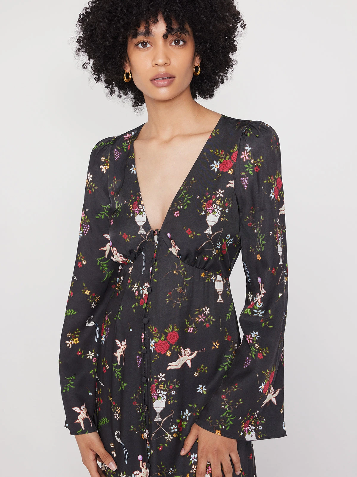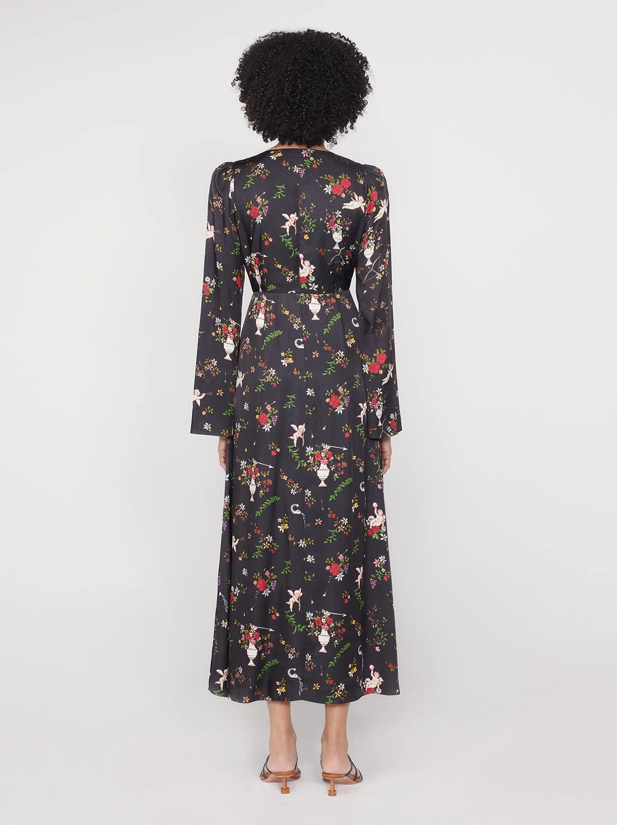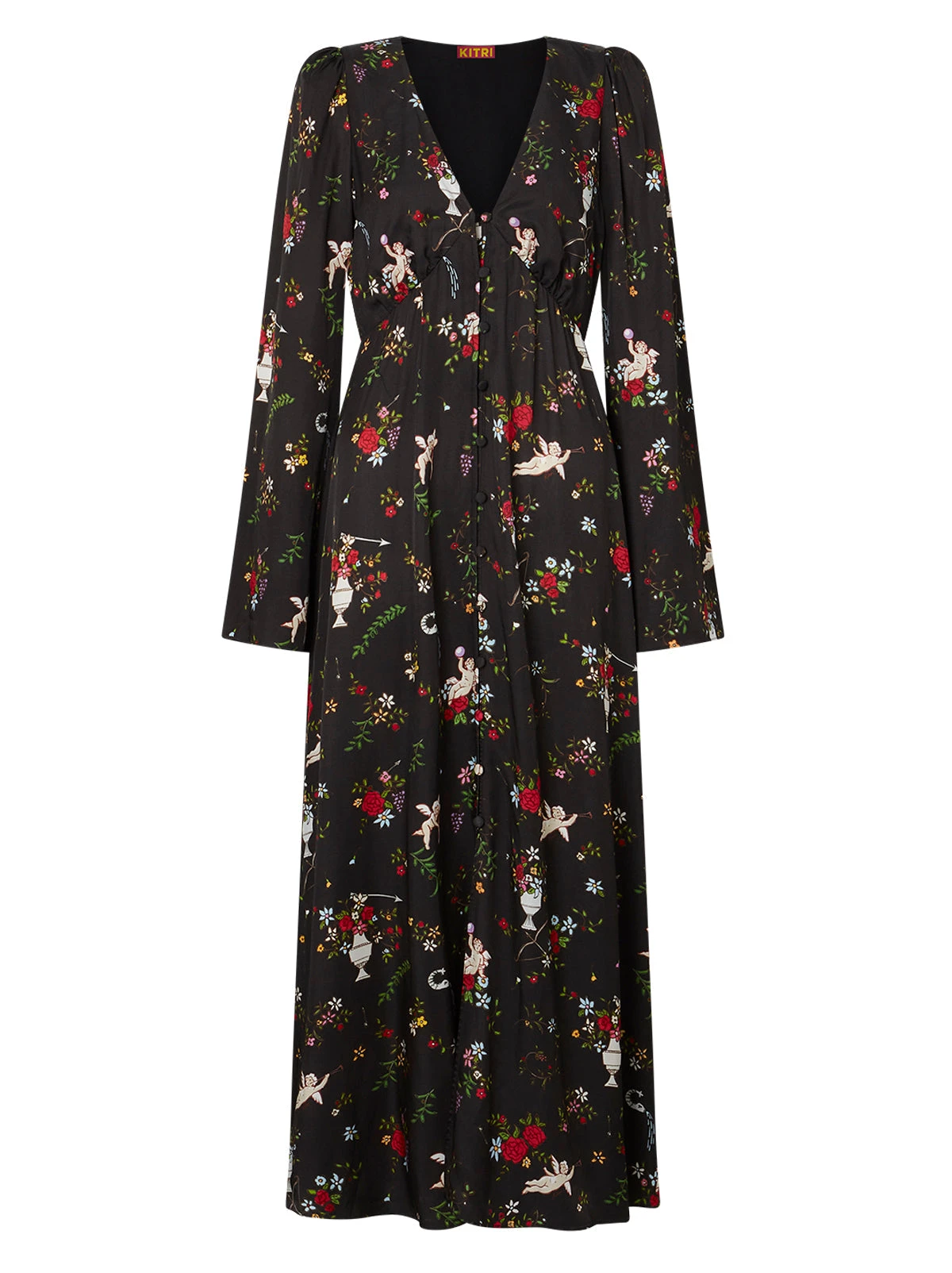 Cupid’s plus one. The ultimate party piece, she features our playful hand-designed Cherub print, perfect for starting conversations. Her flattering flared skirt and sleeves keep things classic and front summary closures punctuate the flowing silhouette.