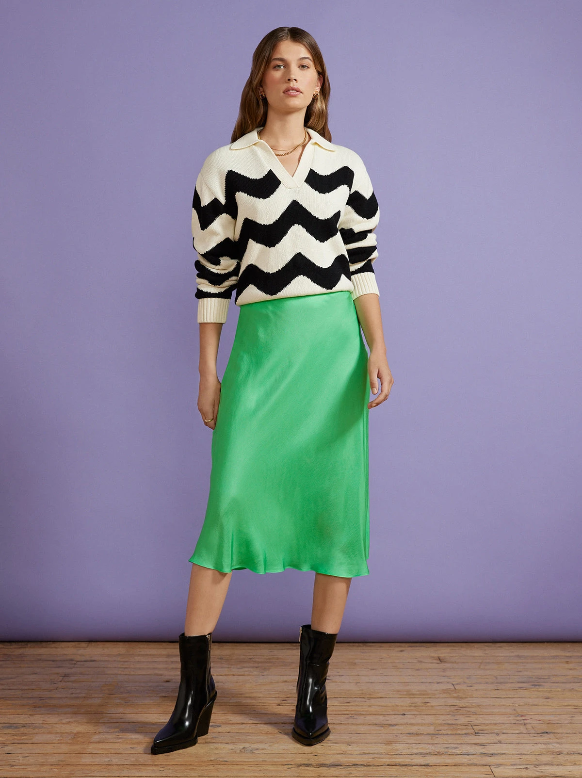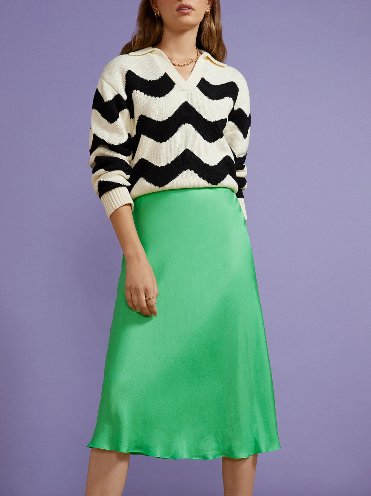 Show off some ankle with Dylan. This is a classic bias cut skirt cut from silky fabric, in a delectable apple green hue. Wear with the matching Cammy Top or Rory Green Diamond Checker Sweater. It’s like the Canadian tuxedo, but KITRI.