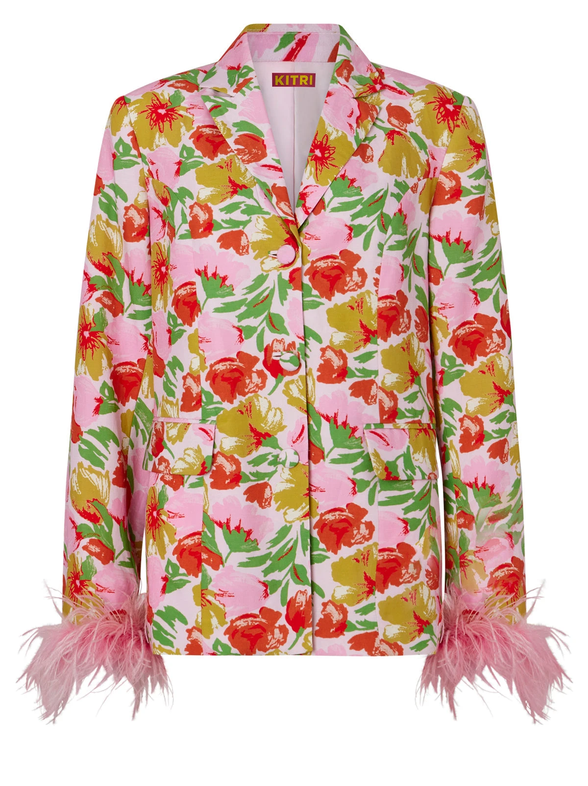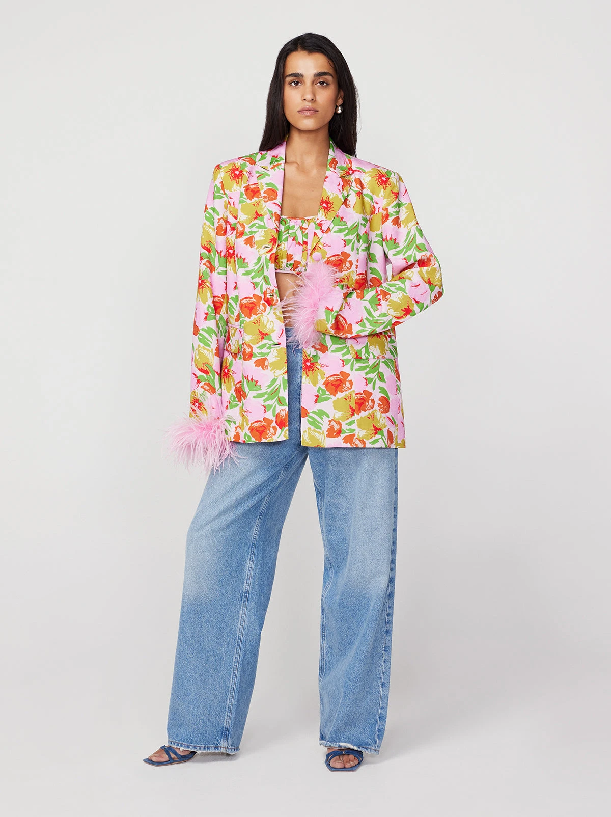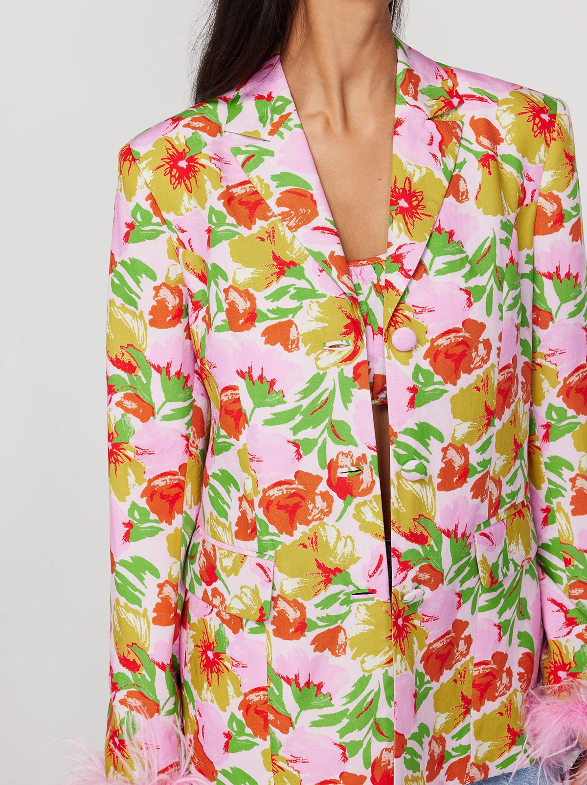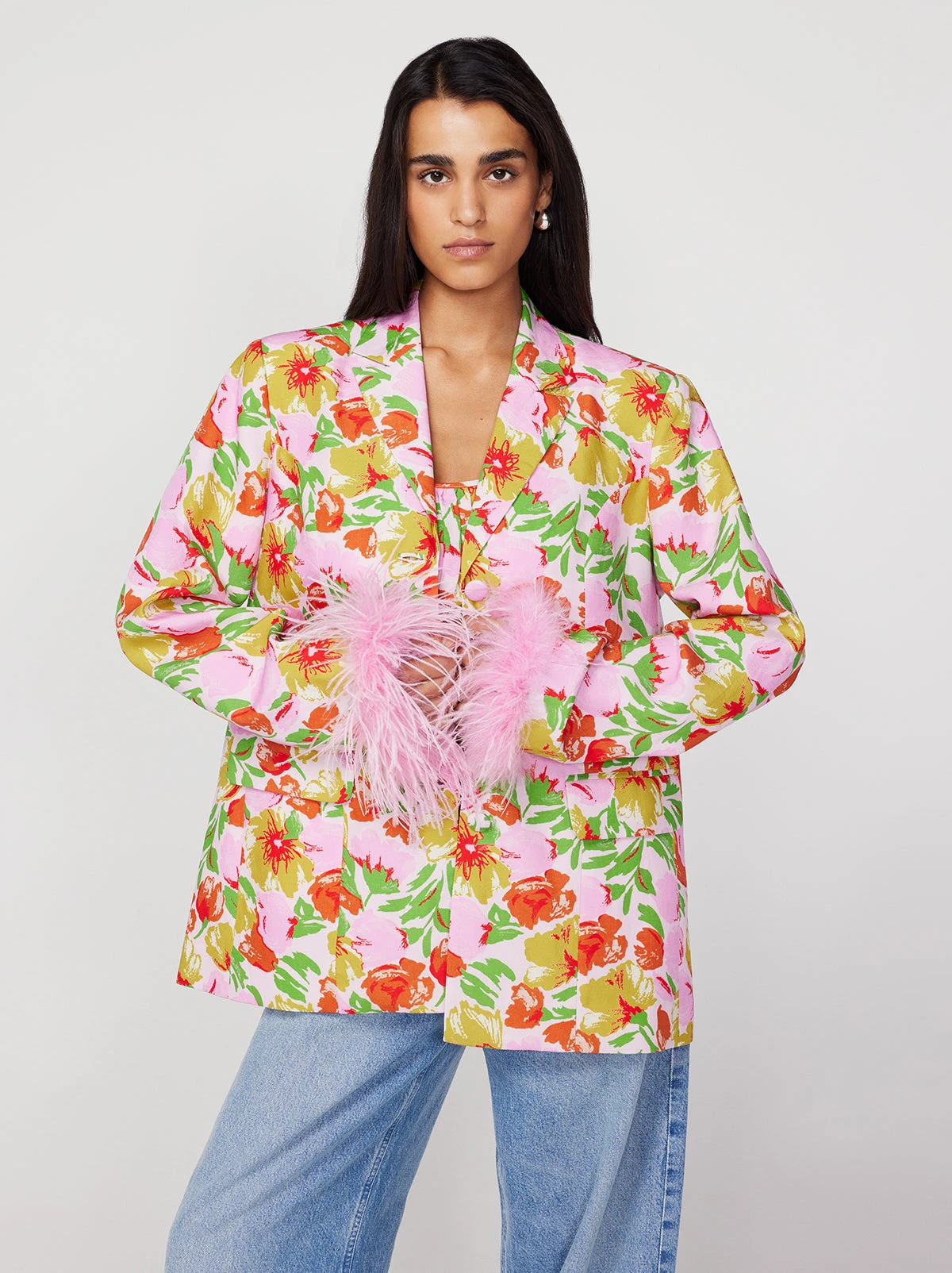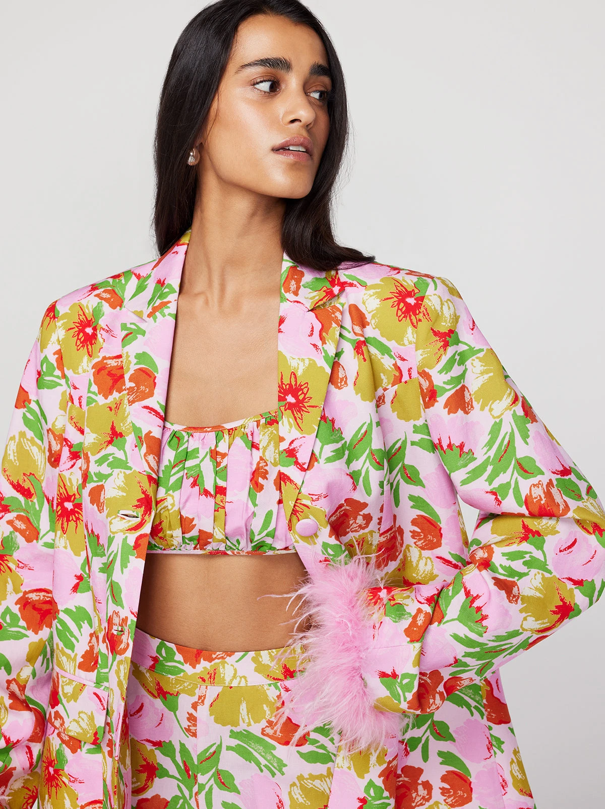 The all-out statement jacket. Emilia brings the drama with her oversized fit, boxy silhouette, detachable feather cuffs and revere collar. Go bold and make it memorable in our pink garden floral three-piece, wearing her with coordinating Clarice Top & Angelina Trousers.