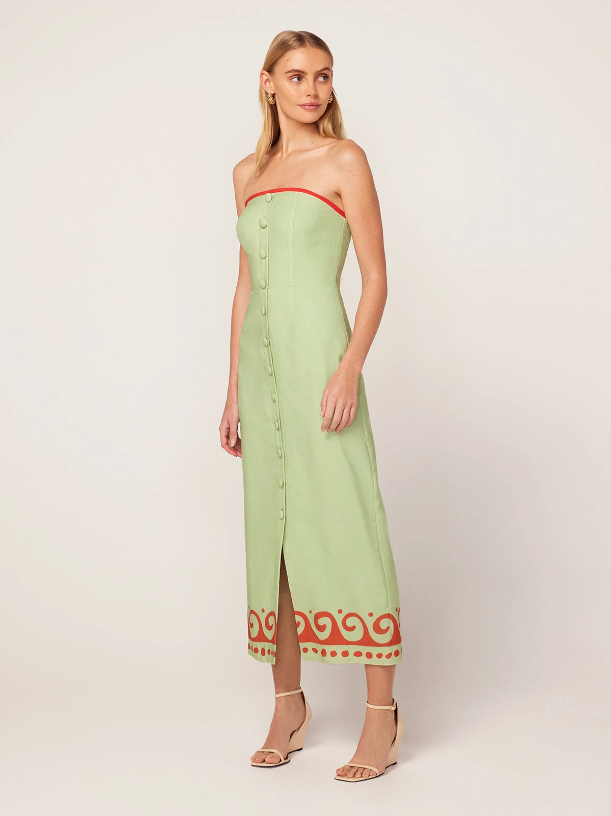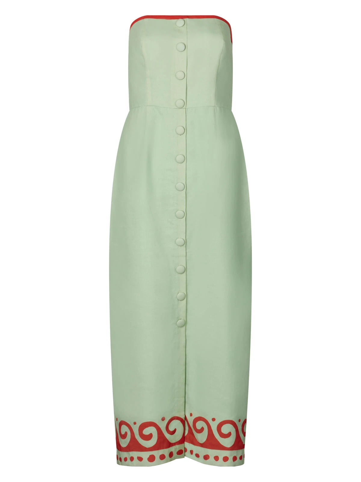 Show (more than) a scintilla of skin. Gilda is a sizzling, strapless number with a ’90s-inspired silhouette in fresh Pistachio green. Her straight-fitted skirt is bordered with our in-house designed contrast Wave print. She has a shirred back for comfort and a lined bodice, providing a flattering fit. She’ll look great with that tan you’ve been working on too.