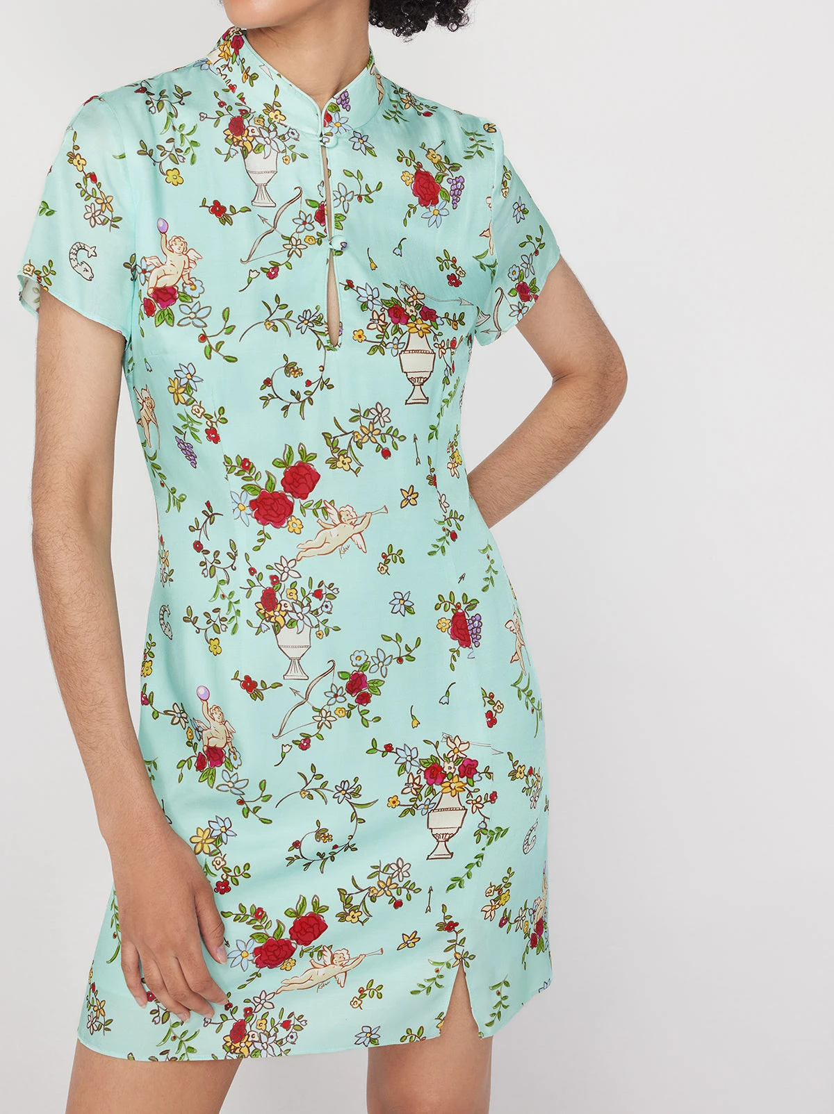 Ready to fall in love? Gretchen is a flirty mini dress with keyhole cutouts and a front split for a playful edge. Her standing collar, cap sleeves and hand-designed Cupid print keep her feeling classic. She fits like a Harlow through the body too, so you know she’ll look great.