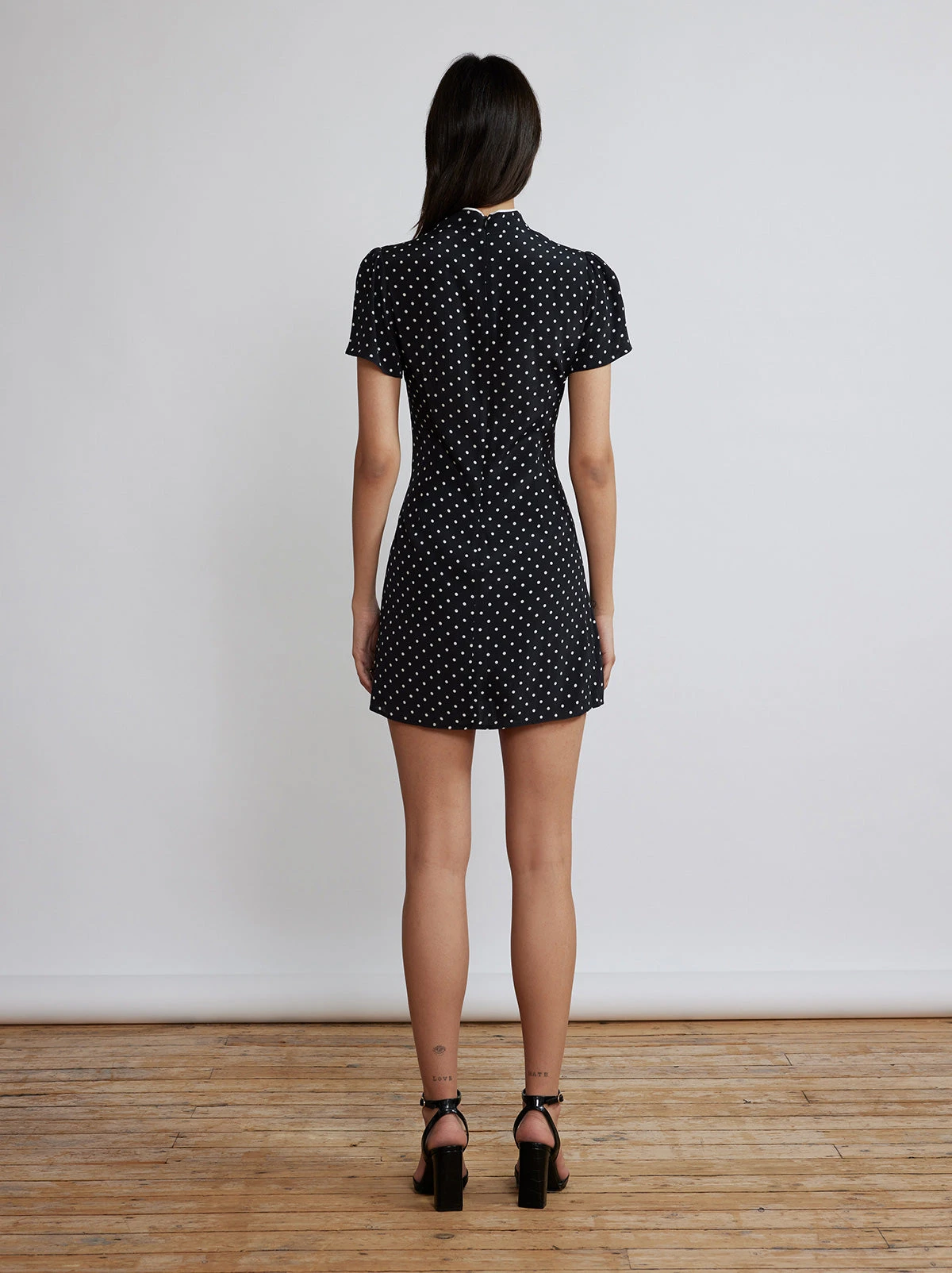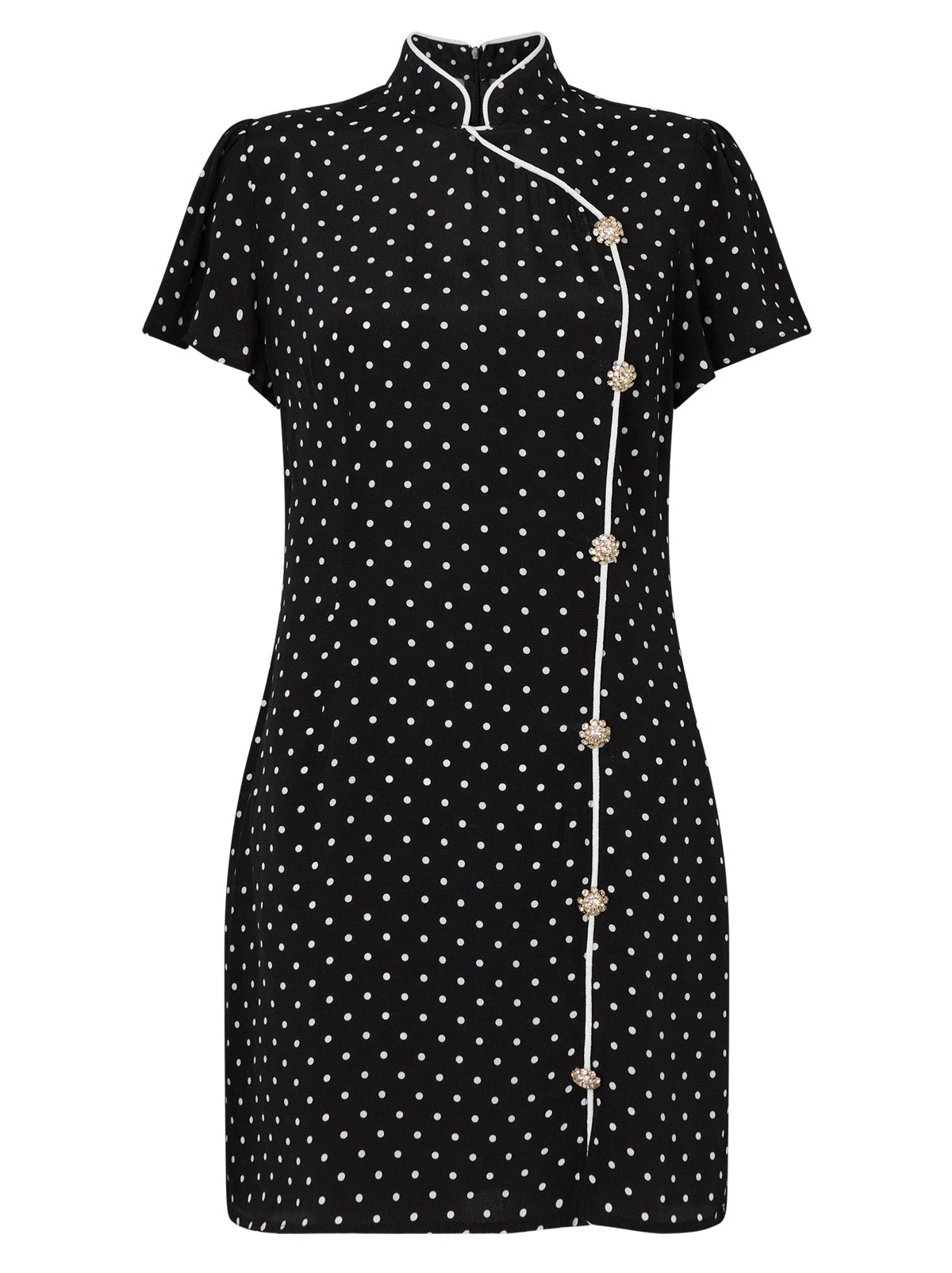Show some leg in our bestselling Harlow dress. A Cheongsam-inspired mini dress cut from lightweight Ecovero/viscose fabrication, she’s adorned with classic polka dot print and ritzy rhinestone summarys down the front to make her the perfect day-to-evening dress.