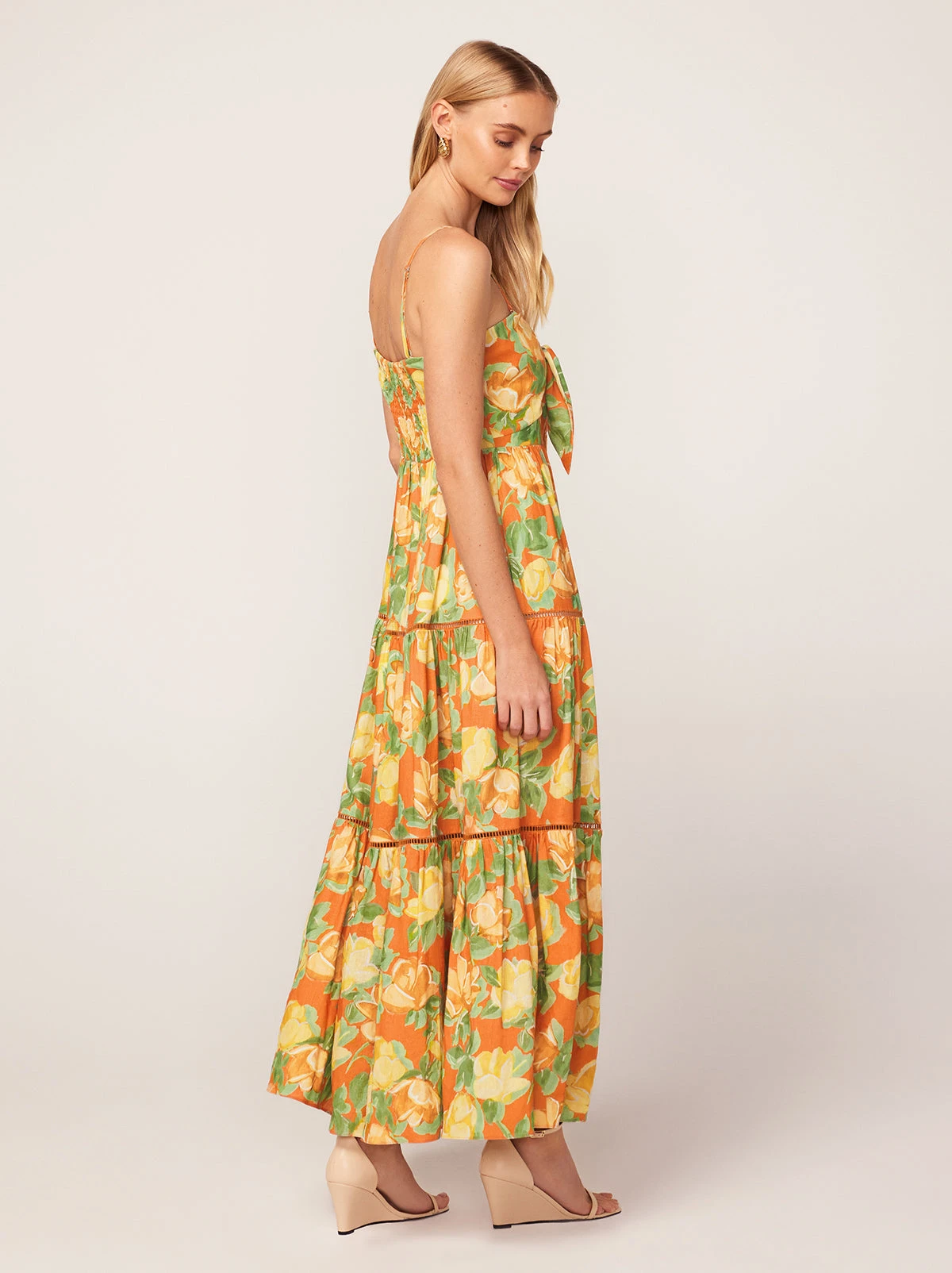 Made for sun-soaking. Immy is a linen-blend tie-front sun dress in summer-ready Apricot Painted Floral print. Her full-tiered skirt features ladder trims for an airy feel and her fitted bodice balances the skirt’s volume. A true one-and-done holiday dress.