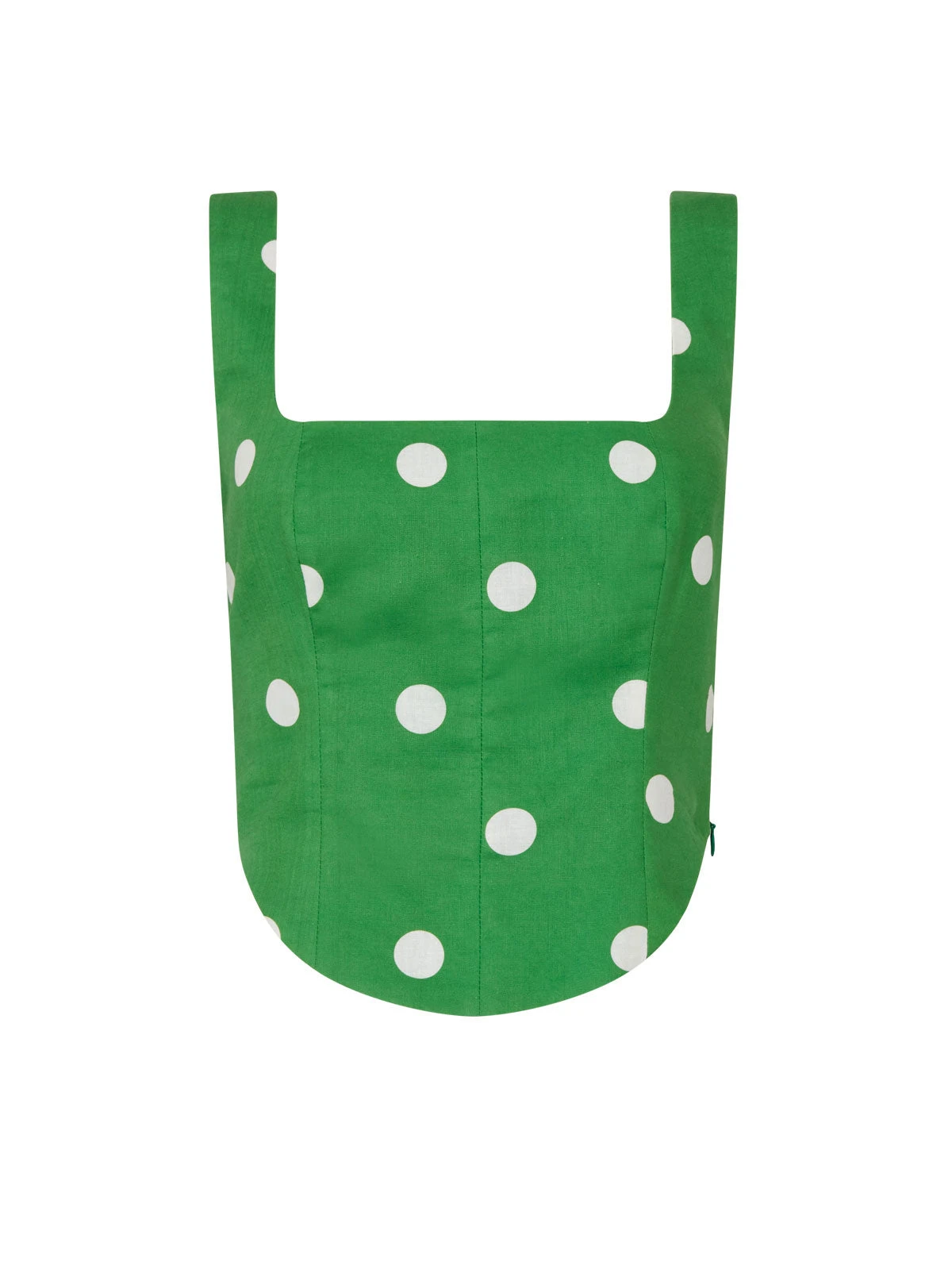 Comfortable corsetry? Oui, s’il vous plait. Ines is a corset-inspired top perfect for sneaking into your suitcase. In our new retro-inspired Green Polka print, her flattering cut and thick (bra-friendly) straps make her comfy and chic. Pair with your favourite high-waisted denim, or match with our Lena Green Polka Dot Shorts for the ultimate polka dot dream.