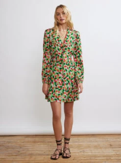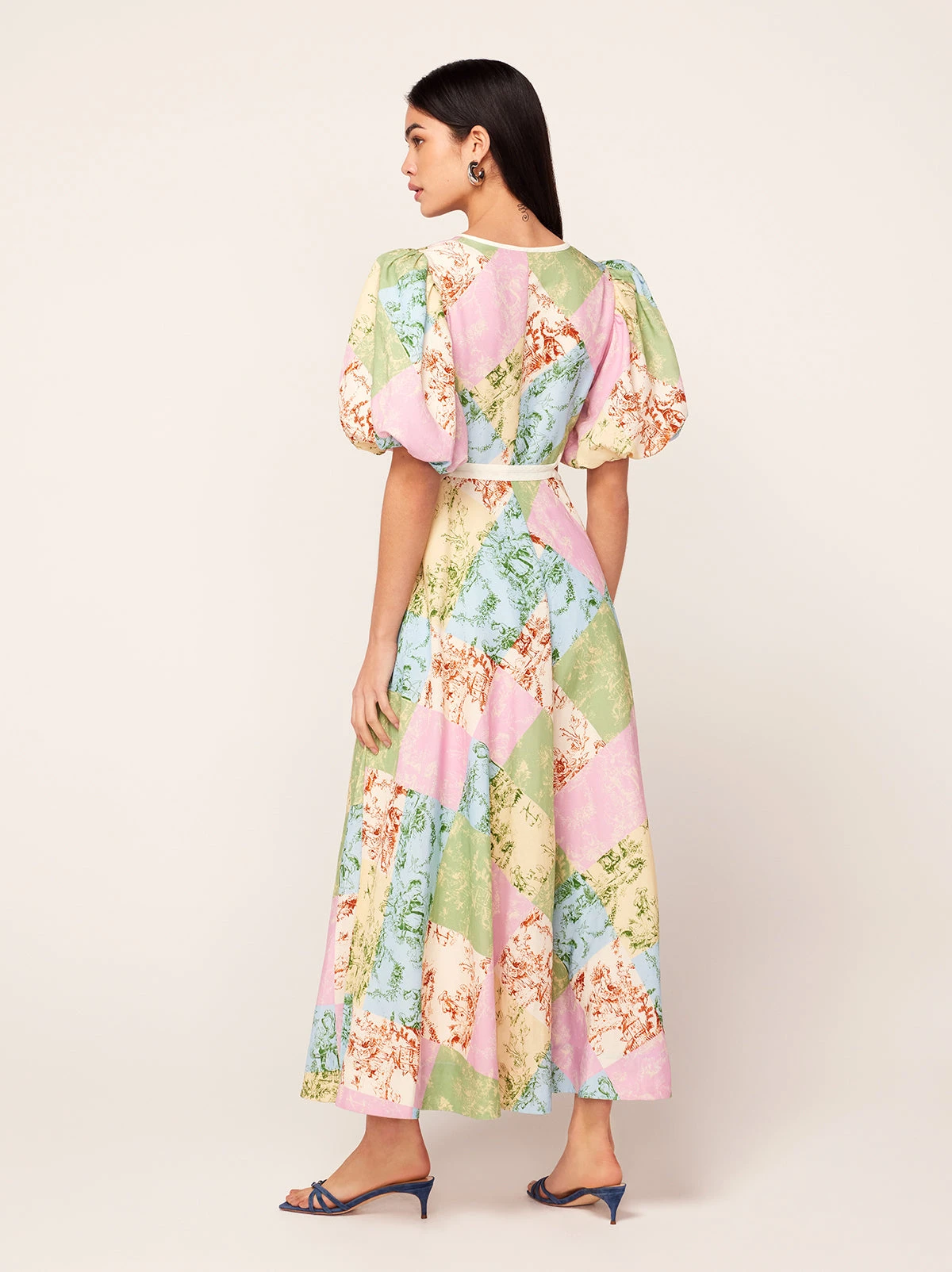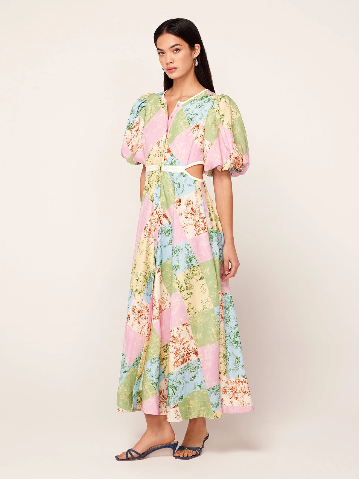 A flare for the dramatic. Isabella’s round neck and flirtatious cutouts are tempered by voluminous flared sleeves and full skirt. Her in-house designed Toile De Jouy takes inspiration from the soft palette of summer in a contemporary patchwork arrangement.