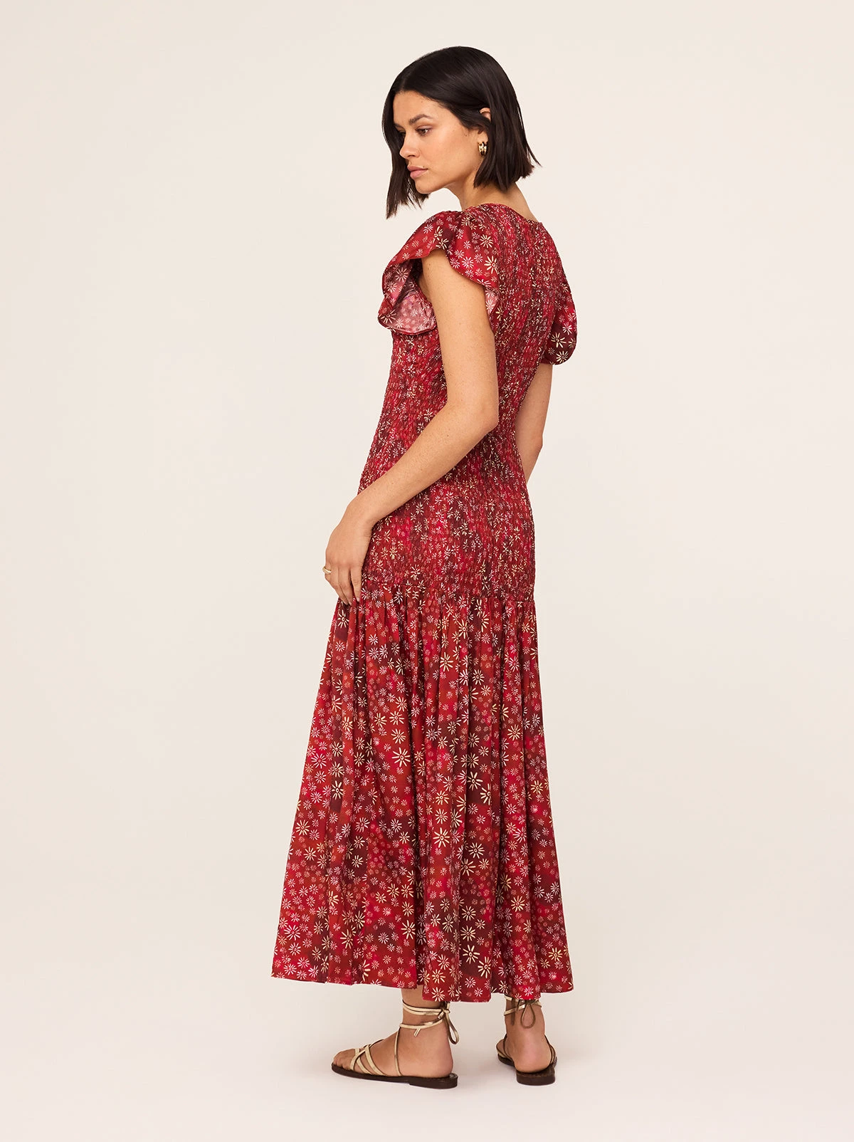 A shirred spectacle. Jemima is the perfect dress for any event on your calendar this year. Her intricately shirred bodice flatters in all the right places before flowing into a gently pleated maxi skirt. Her fluttering flared sleeves add a touch of romance and her hand-painted Red Constellation print adds depth and detail to the look.