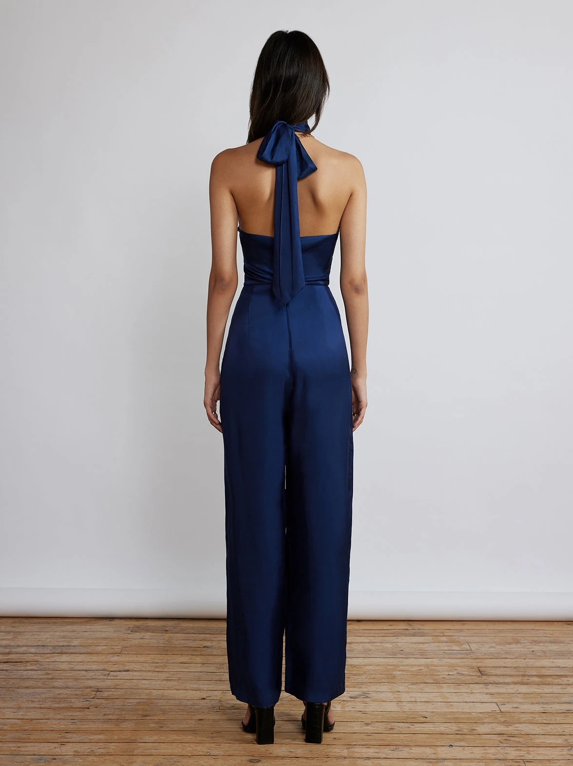 Studio 54 called. Karla is a slick satin jumpsuit with slim fitting bodice and full-length wide leg for an extra cool silhouette.