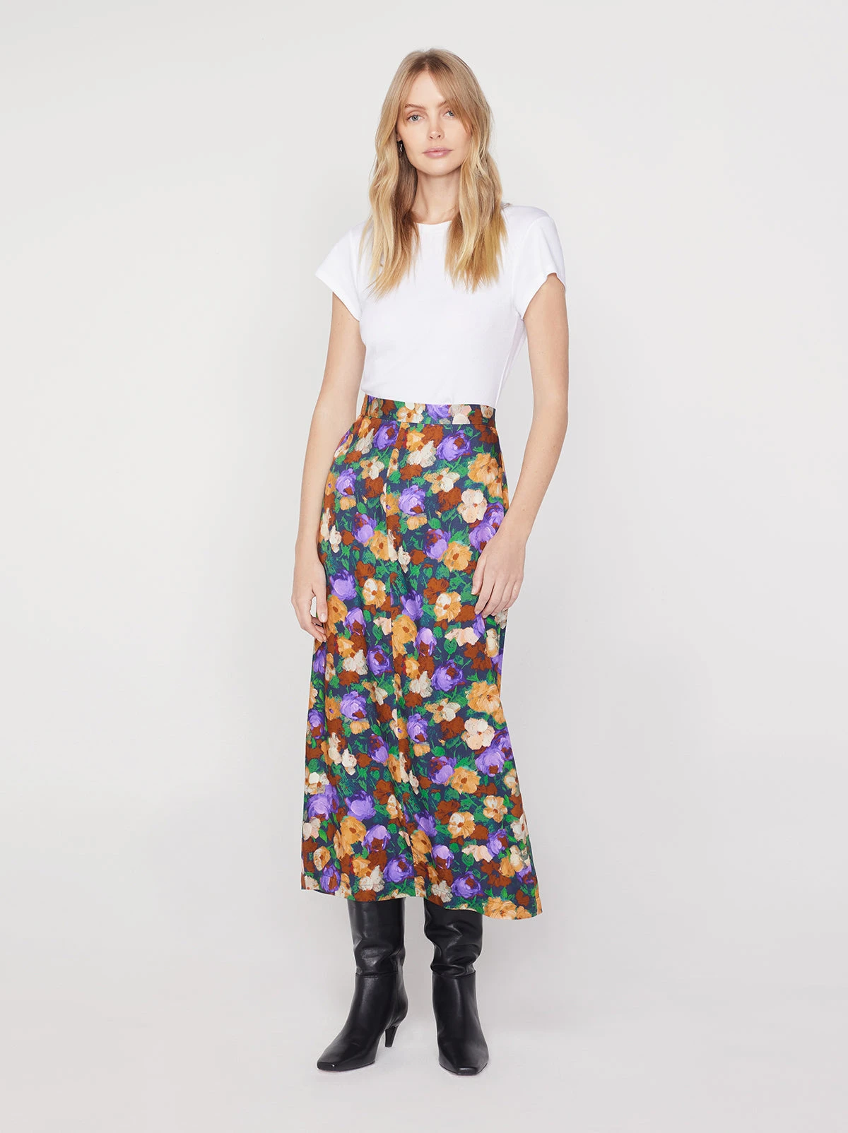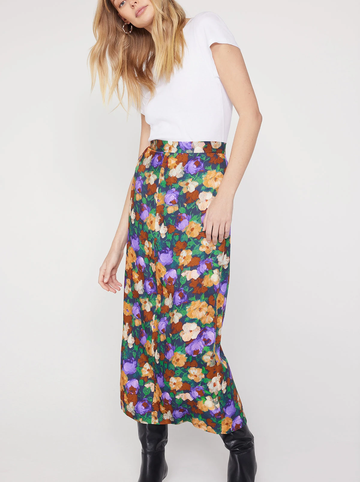Make mine a midi. Laurel’s ’90s-inspired column silhouette and back split adds a touch of glamour to your everyday fit. Pair with our matching Catriona Iris Impressionist Floral Top for the full look.