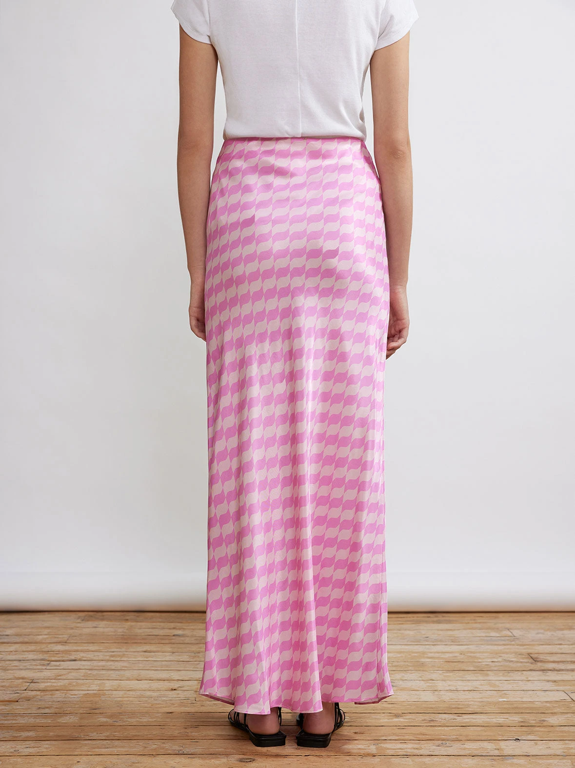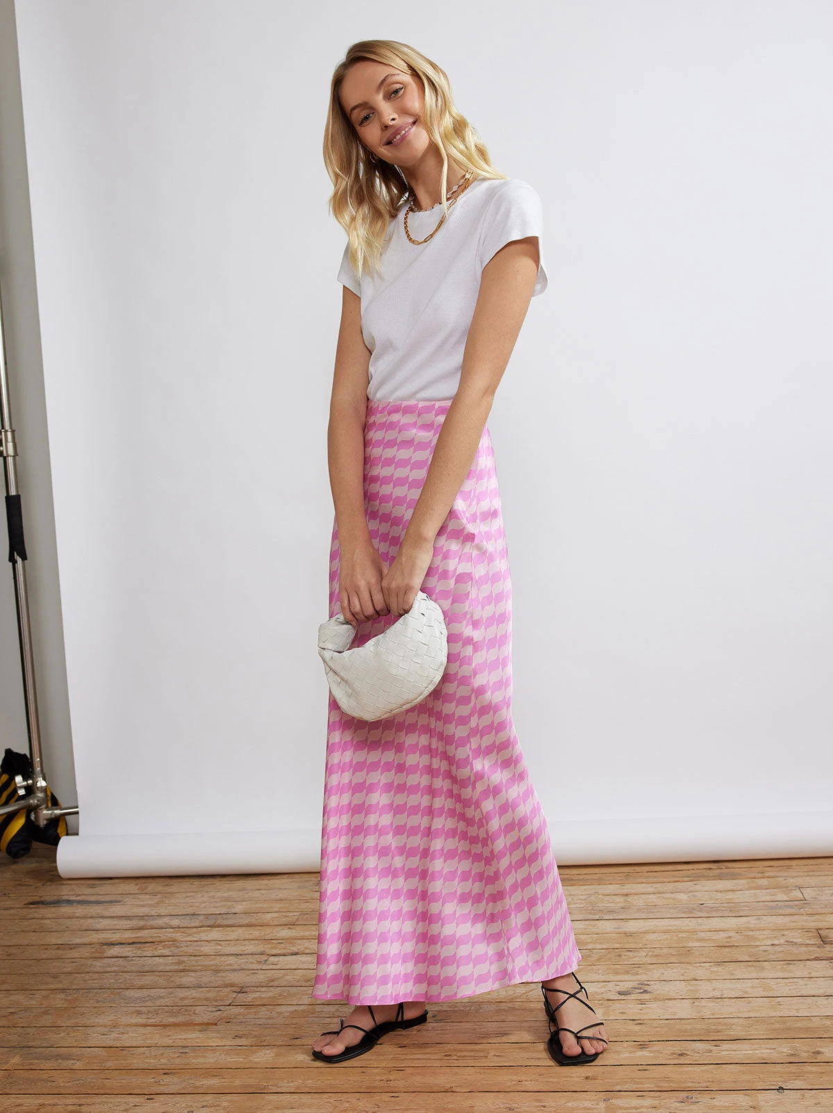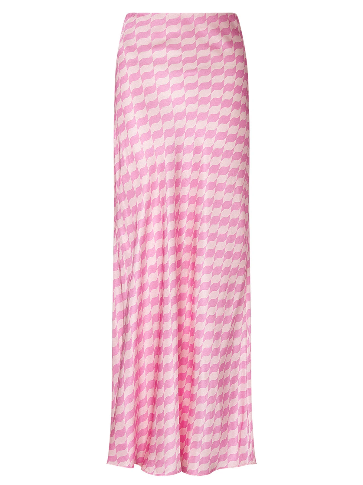 The bias maxi skirt you’ve been longing for. This high-waisted, floor sweeping wonder is as flattering as it is fabulous. Our retro-inspired Pink Wavy Tile print adorns the silkiest viscose fabrication for extra swoosh factor.
