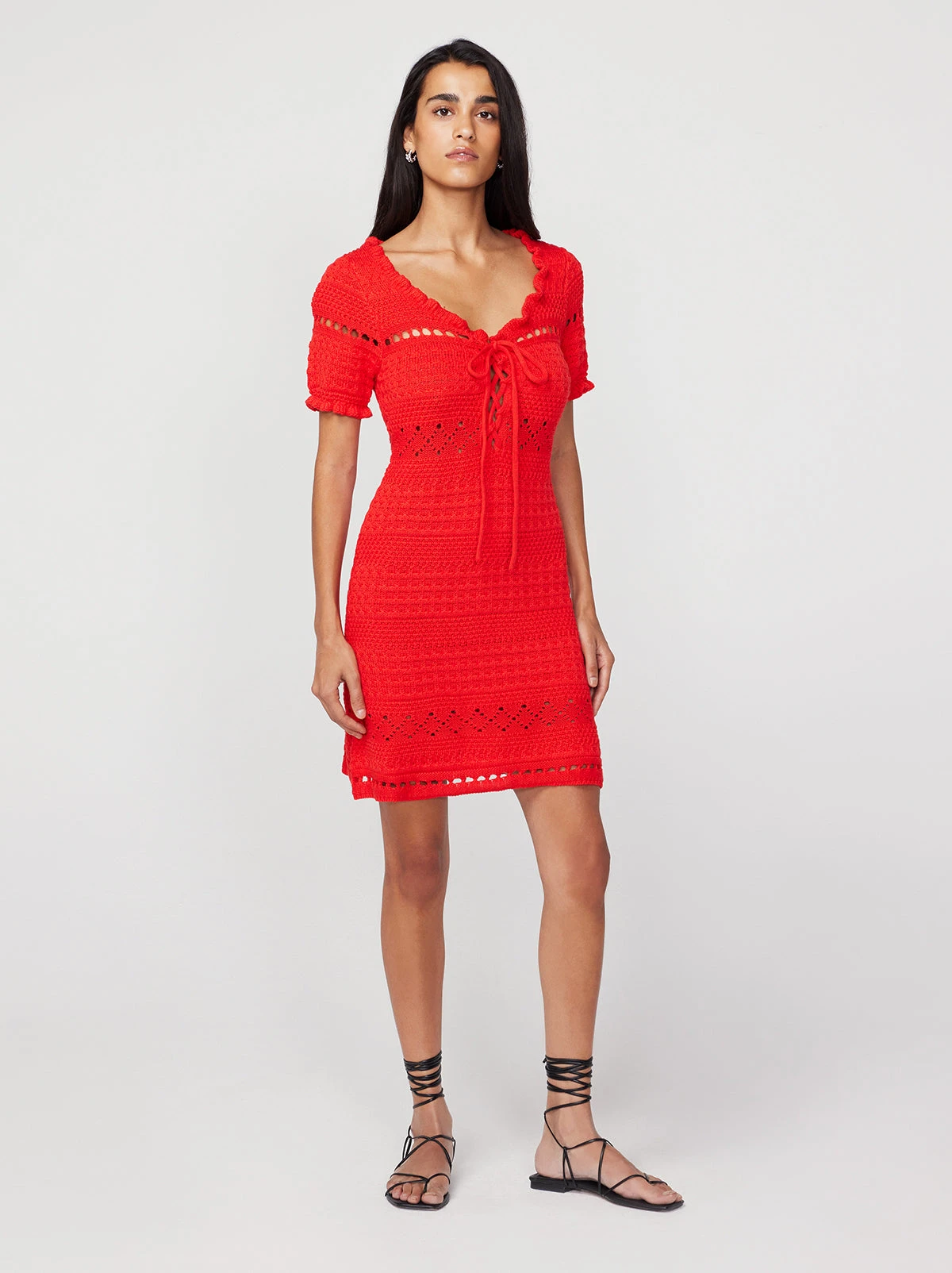 Make mine a mini. Leonie is a tomato red knit dress with short sleeves and crochet cut-outs. Her compact knit means you can wear her alone or layered for easy styling season after season – no slip needed! Wear her with your favourite sandals for an easy look as the weather warms.