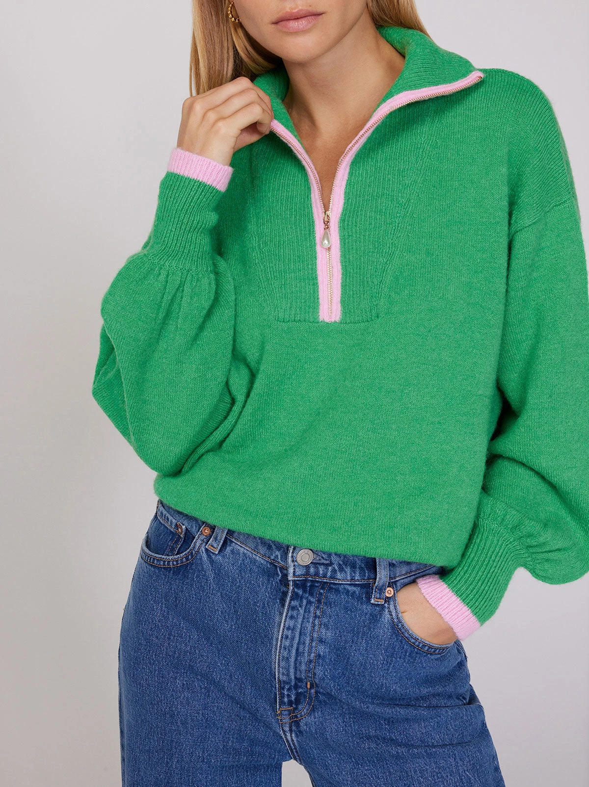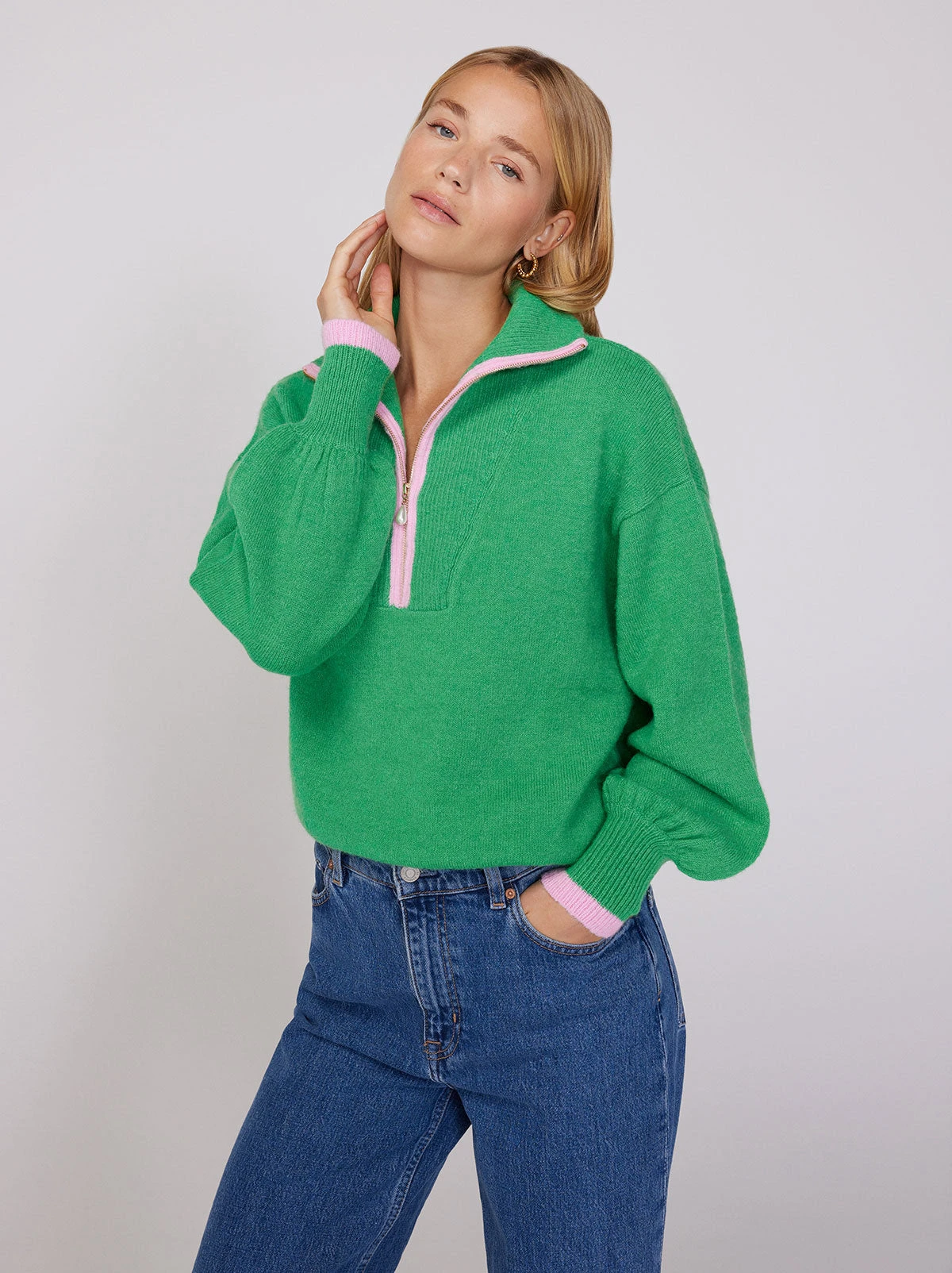 Our famous Lorna Green Sweater is back! Lorna is a lightweight alpaca blend sweater featuring a pearl-tipped quarter-zip and drop shoulder, puffed sleeves. Thanks for the sweater, dad.