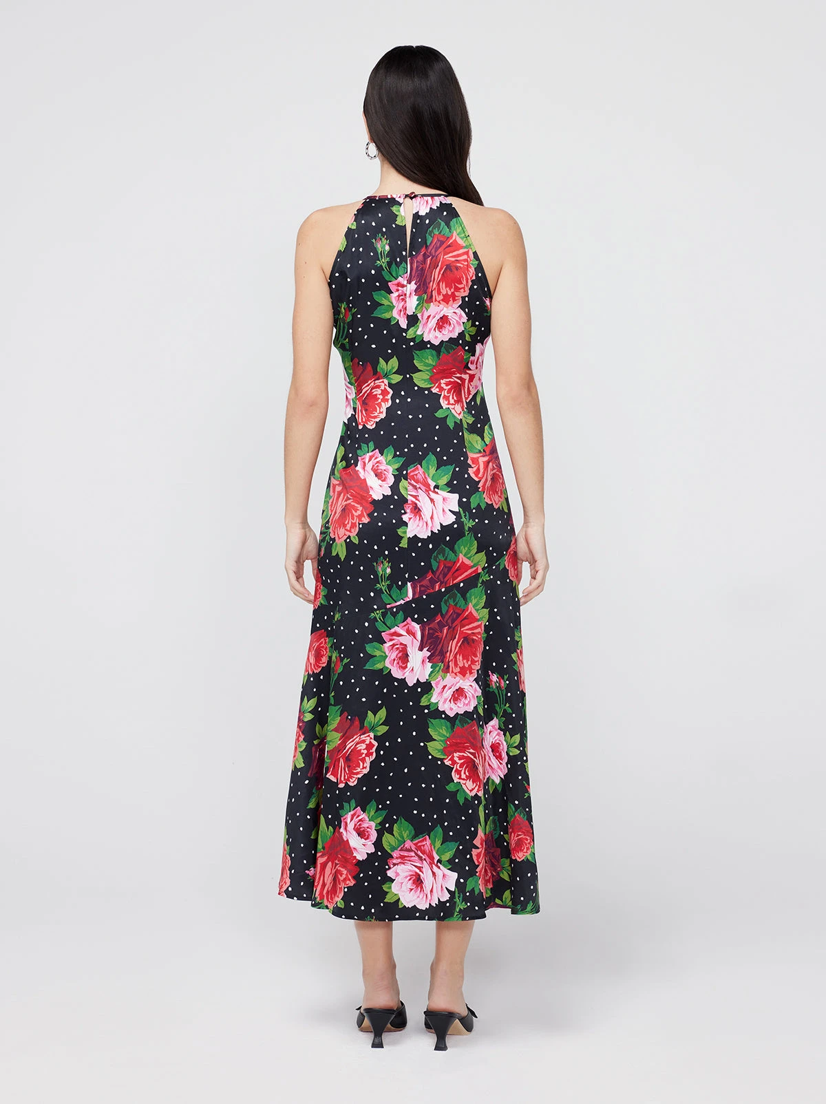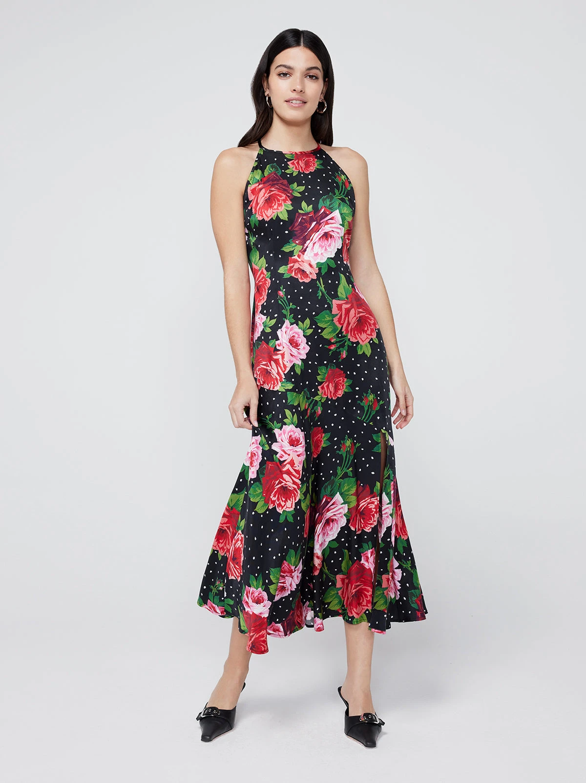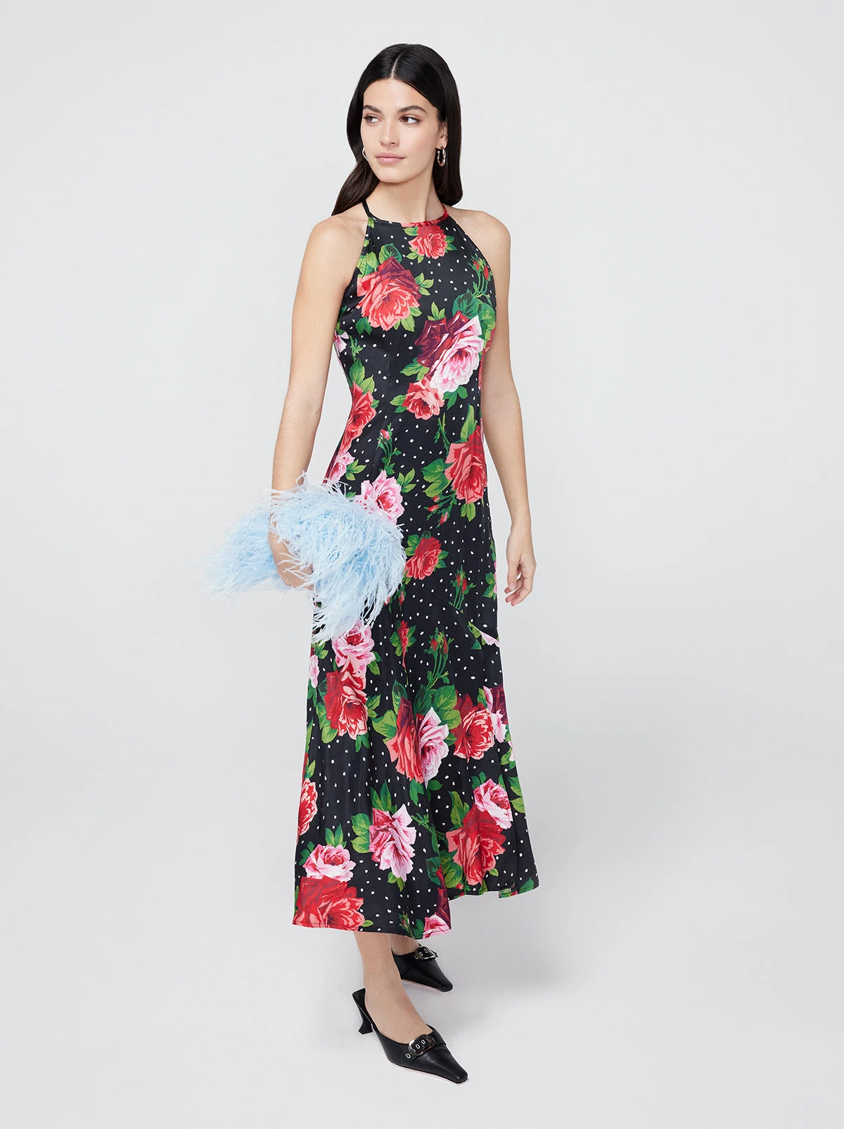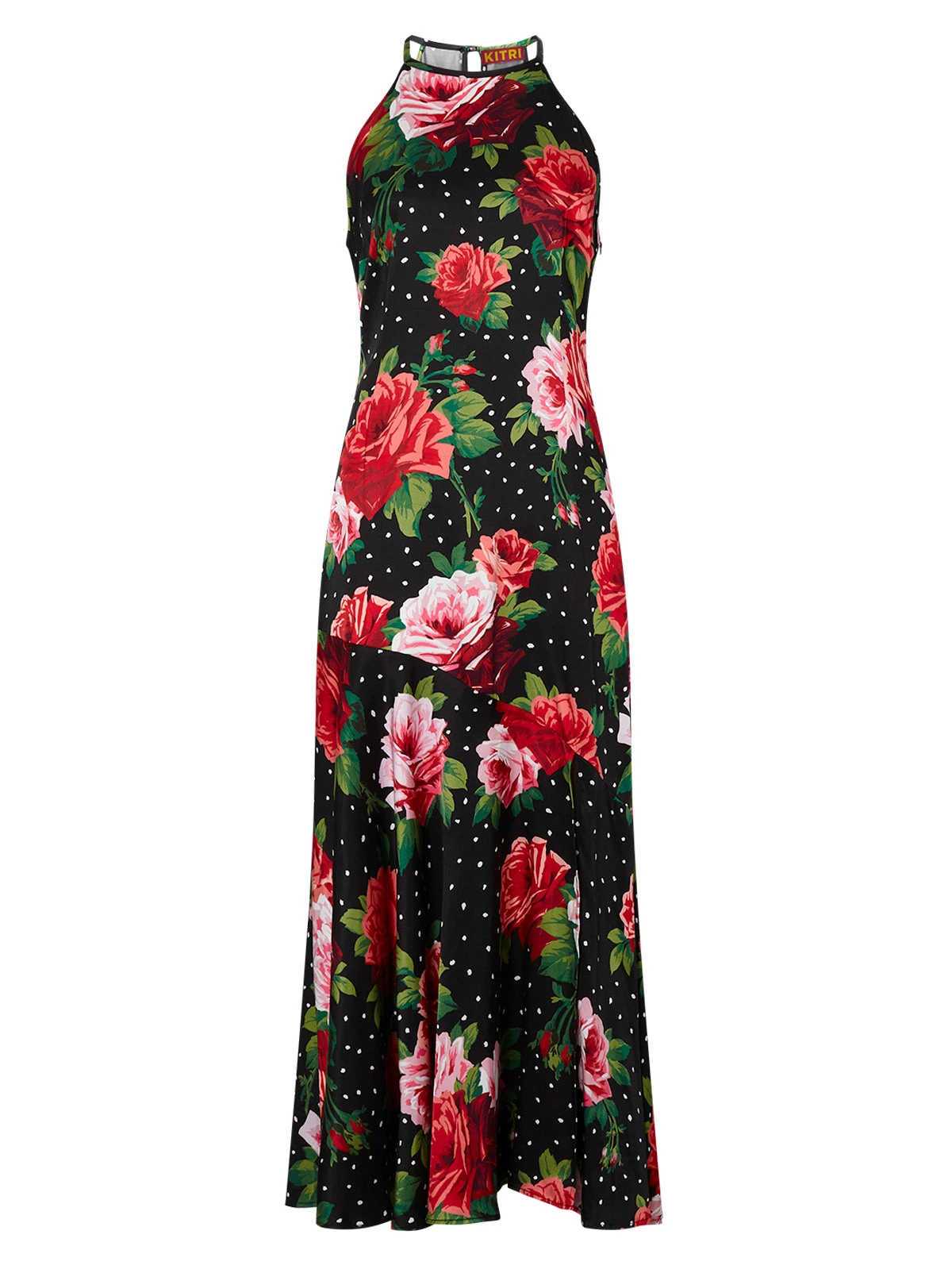 Meet me in the rose garden. Lucia is a satin twill maxi dress with racer neckline for a little edge. Her Red Painted Rose print is hand-drawn in-house, because we’re all about wearable art.
