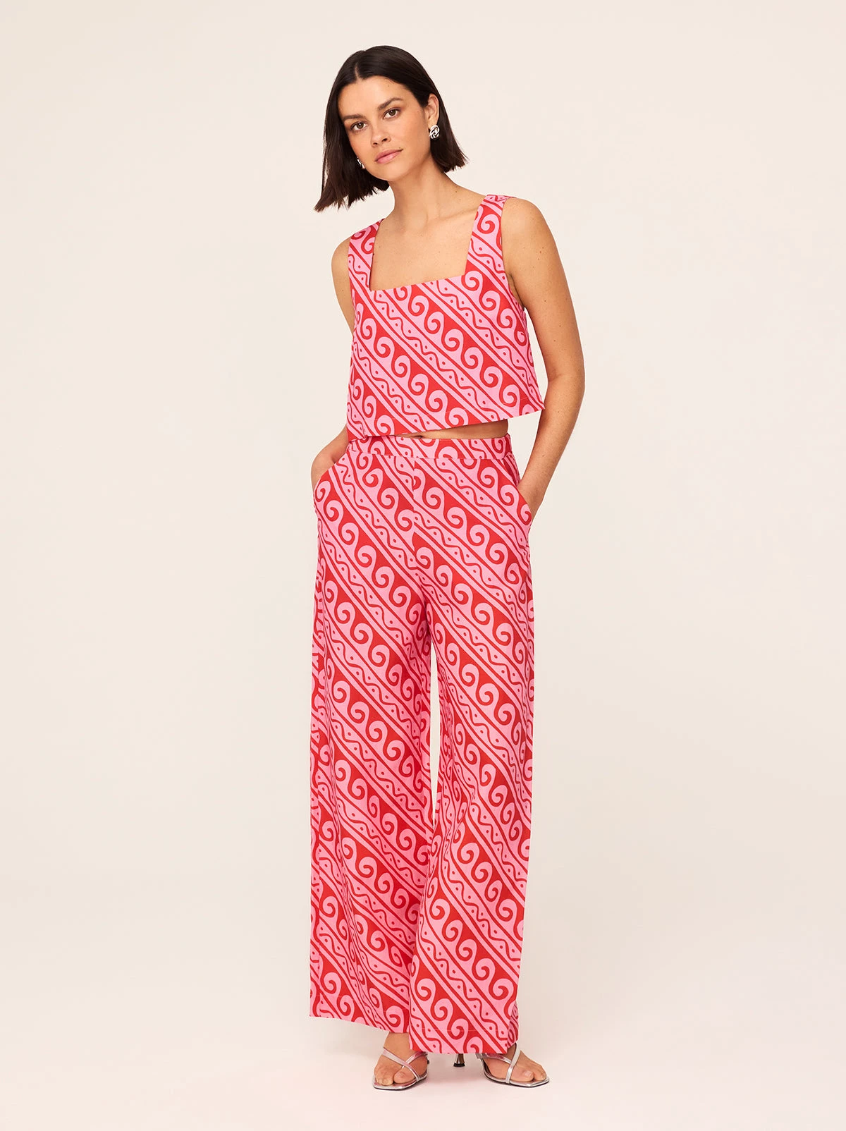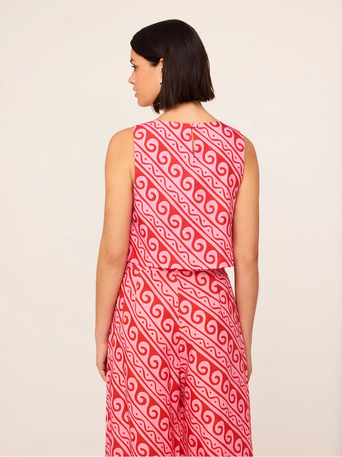 That nice top you’ve been looking for. Maeve is gently cropped and designed to hit the top of your trousers perfectly. Her easy, boxy shape keeps things breezy and square neckline flatters. Her straps are thicker to keep her bra-friendly too (you’re welcome). Pair with matching Cosima Pink Wave Print Trousers for the ultimate easy-breezy summer look.