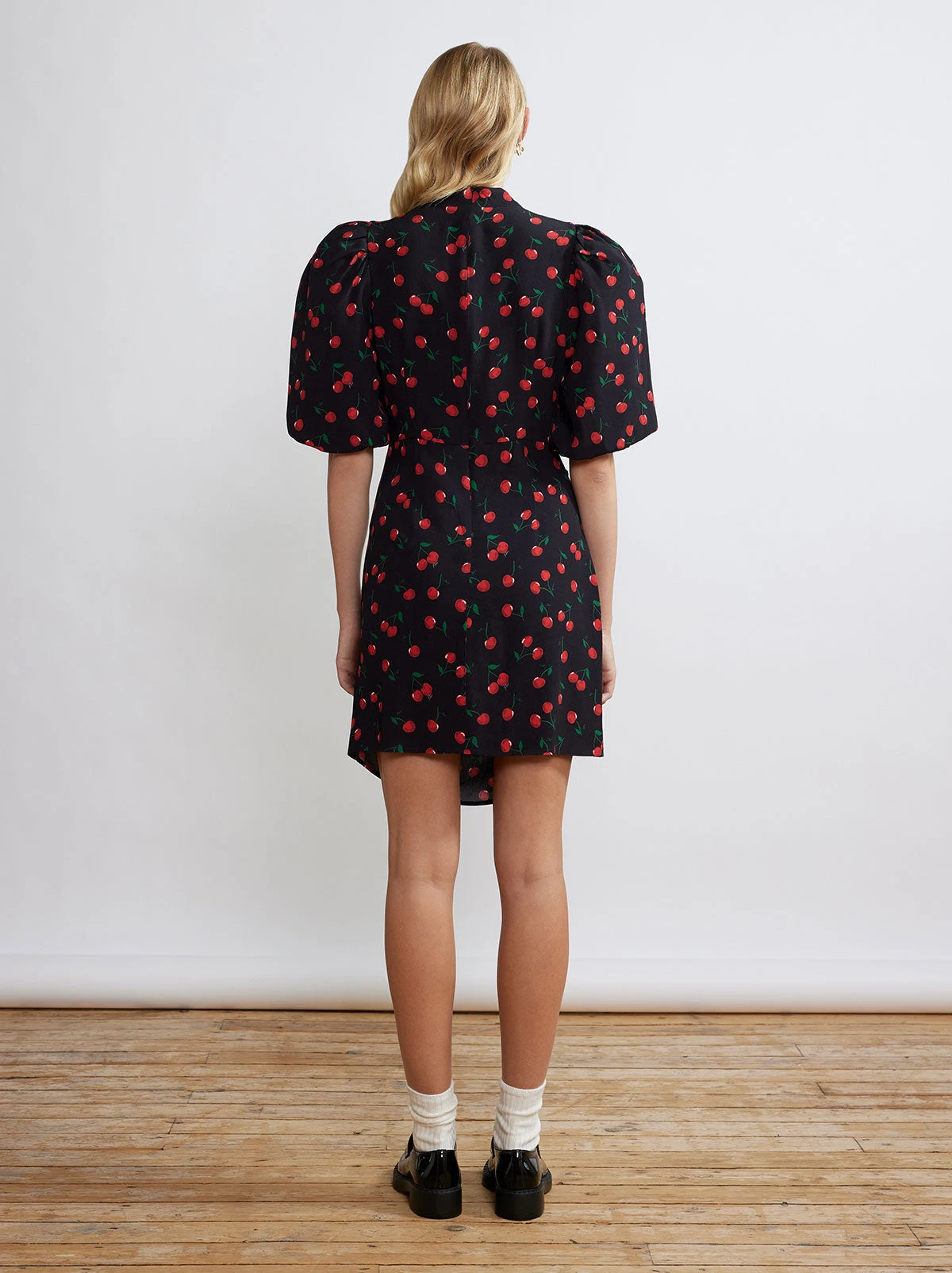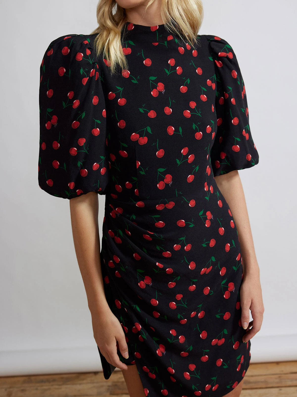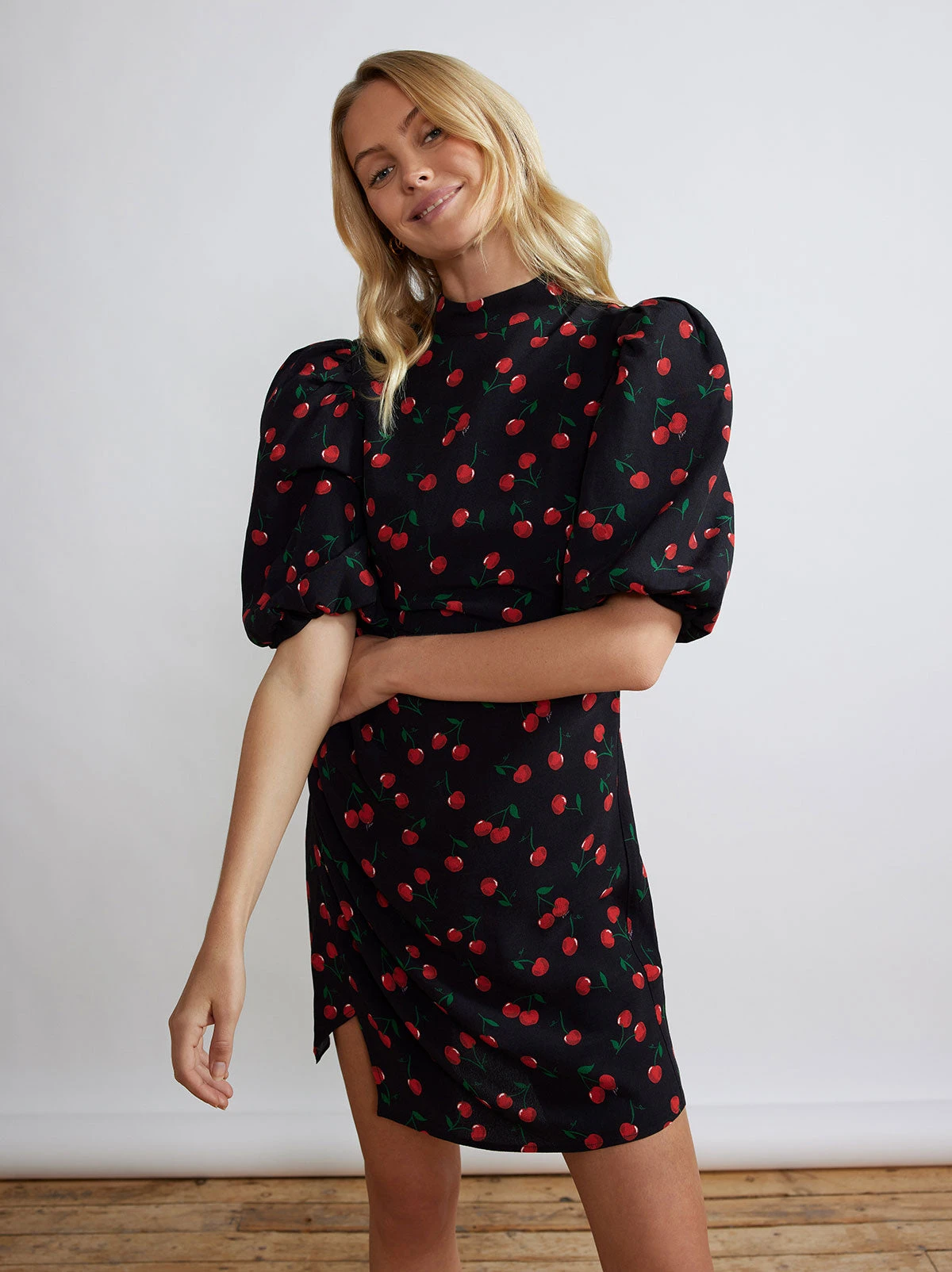 Ooh la la! Isn’t Maisie the dress of your spring dreams? Her exaggerated ’80’s inspired puff sleeves and delectable Black Cherry print giver her retro-appeal, whilst her faux wrap skirt flatters in all the right places (perfect post-pasta attire). Wear her with tights, or dare to bare as the weather warms.