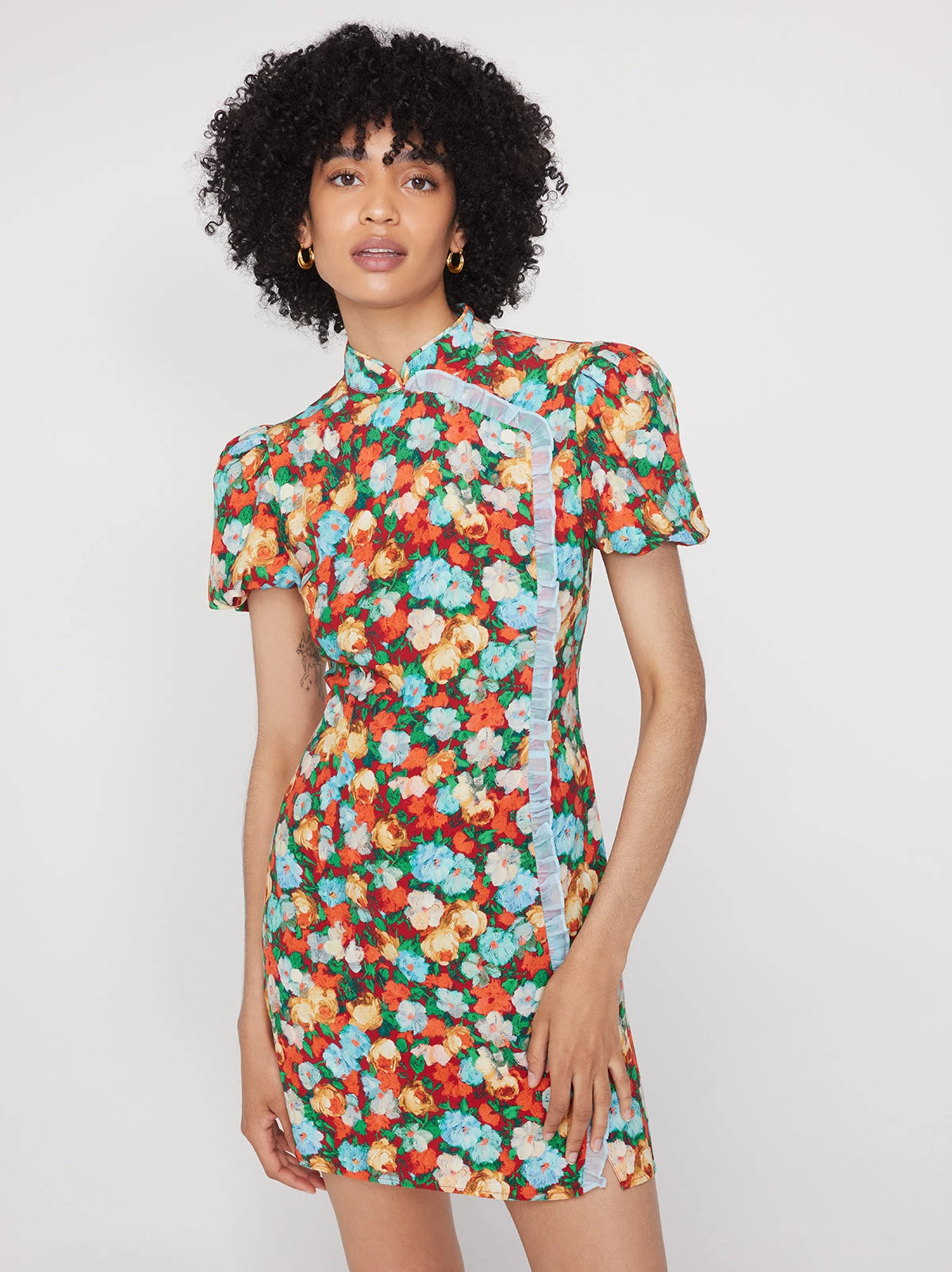 Make an impression. Philippa is a puff sleeve mini dress with attitude. Her ’90s-inspired standing collar and contrast organza micro-frill detailing bring the drama and her Cezanne-inspired Blue Impressionist Floral print gives a nod to all things artful. She fits like a Harlow through the body too, so you know she’ll look great.