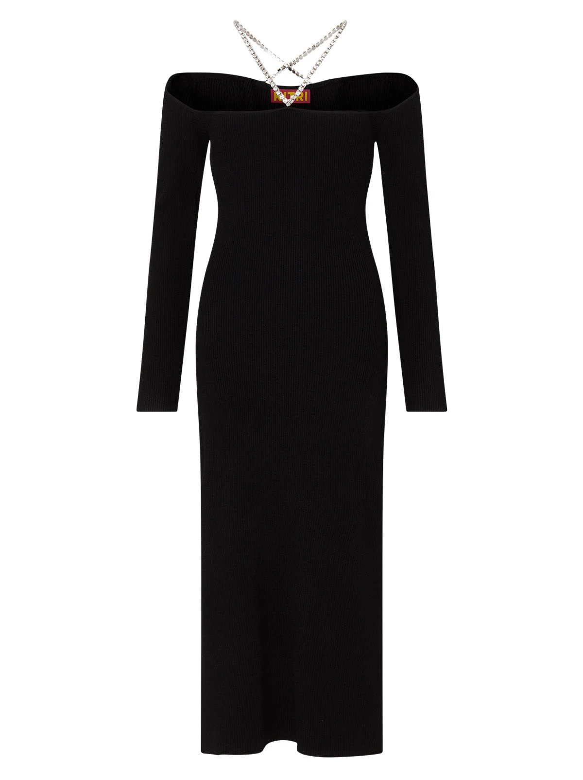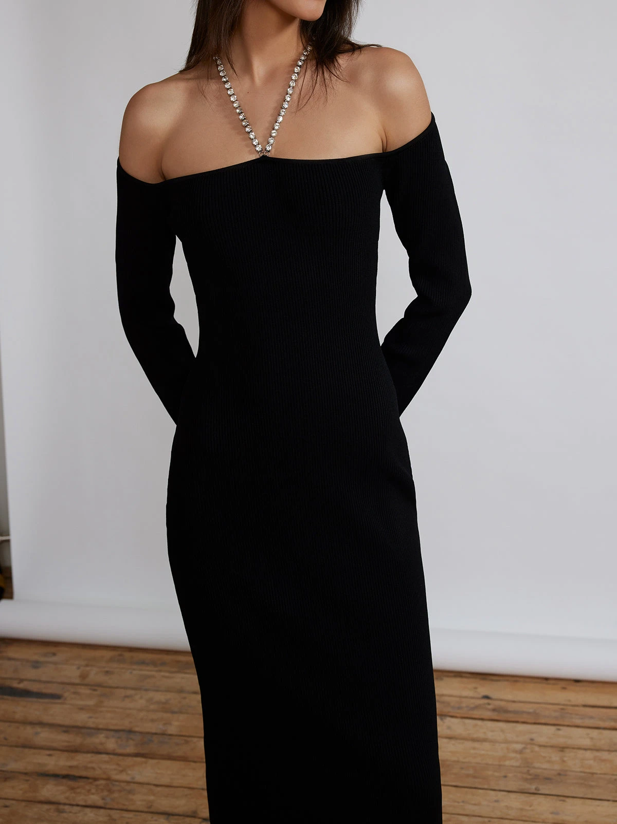 The ultimate do-it-all dress you need this season. Crafted from a luxurious ribbed viscose blend, Renee will flatter in all the right places. Her flirty bardot neckline is accentuated further by her detachable rhinestone neck detail, perfect to pop on once 5pm hits.