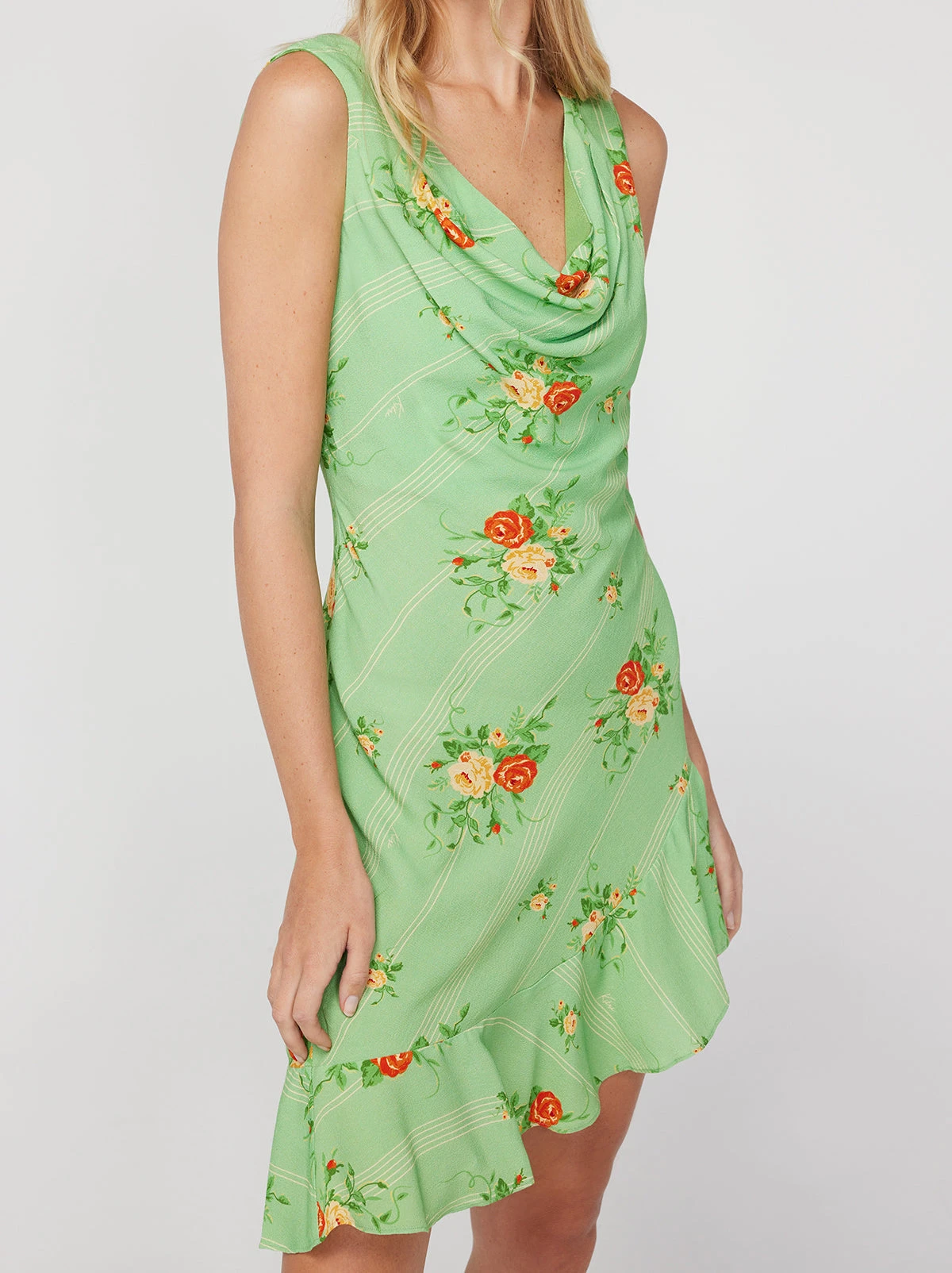More is more. Roberta’s cowl neck and asymmetric ruffle hem make her the best dress for any spring rendezvous or soiree. Her in-house designed Green Wallpaper Rose print takes inspiration from the delicate illustrations found adorning vintage wallpapers.