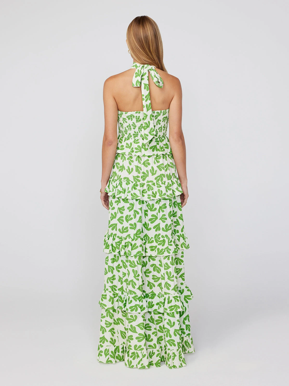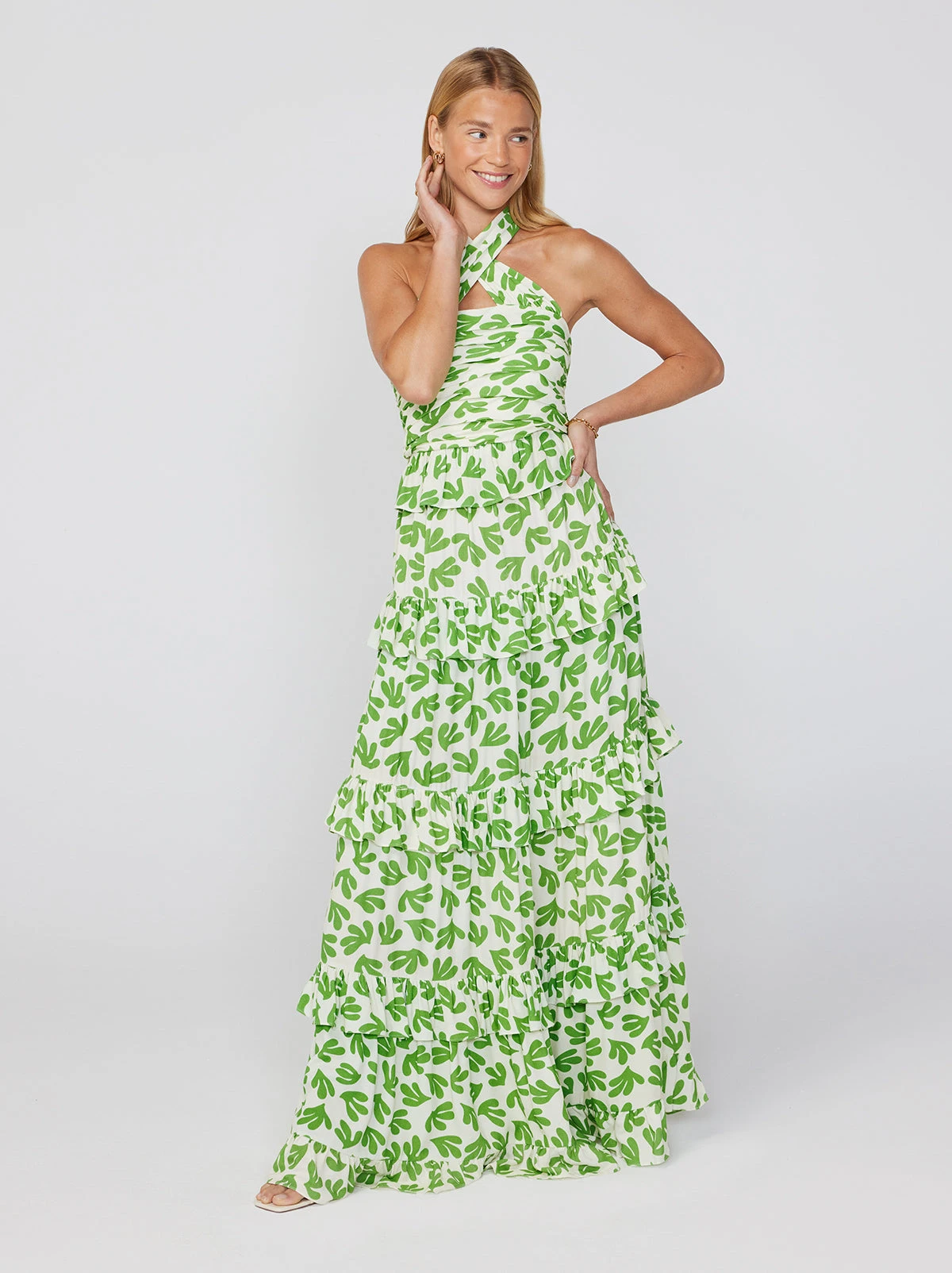 She’s a show-stopper. Introducing Romily, our full-length floor-sweeping maxi who brings all the drama. Her cross-halterneck and shirred back keep things comfortable, whilst her five-tier skirt provides the perfect swish.