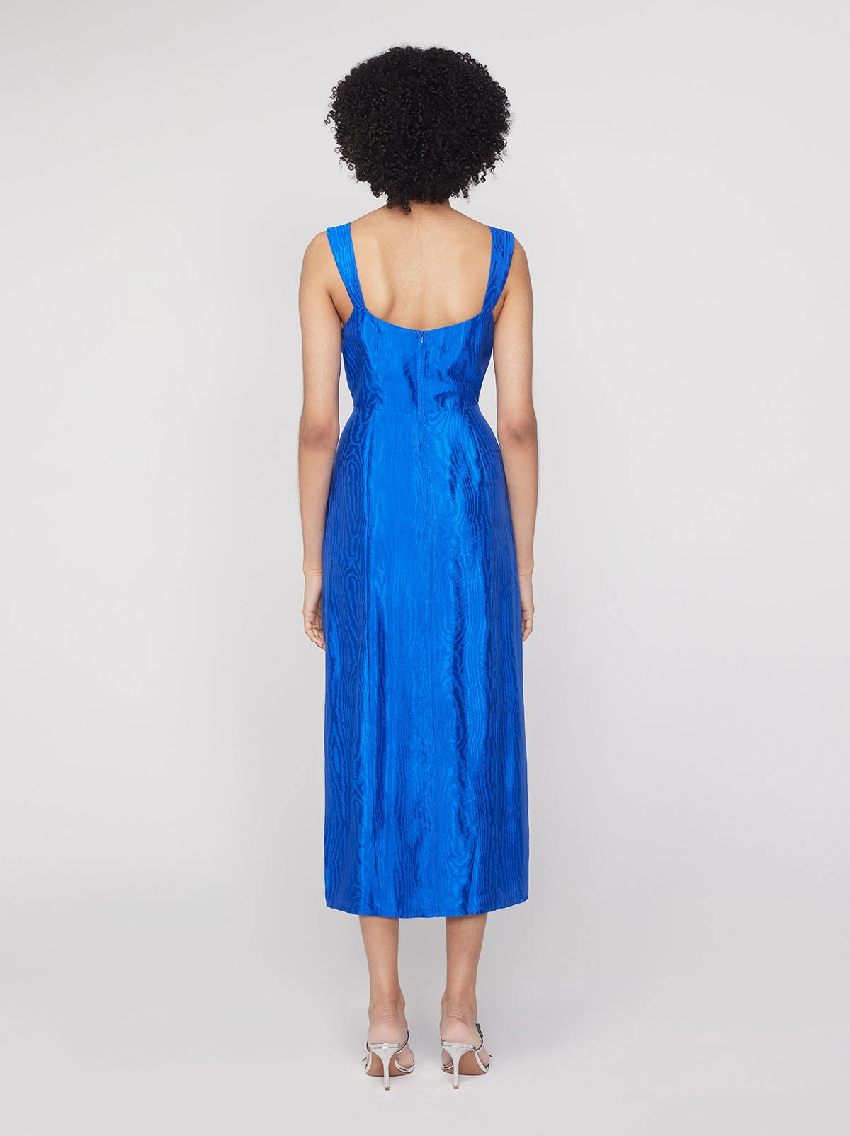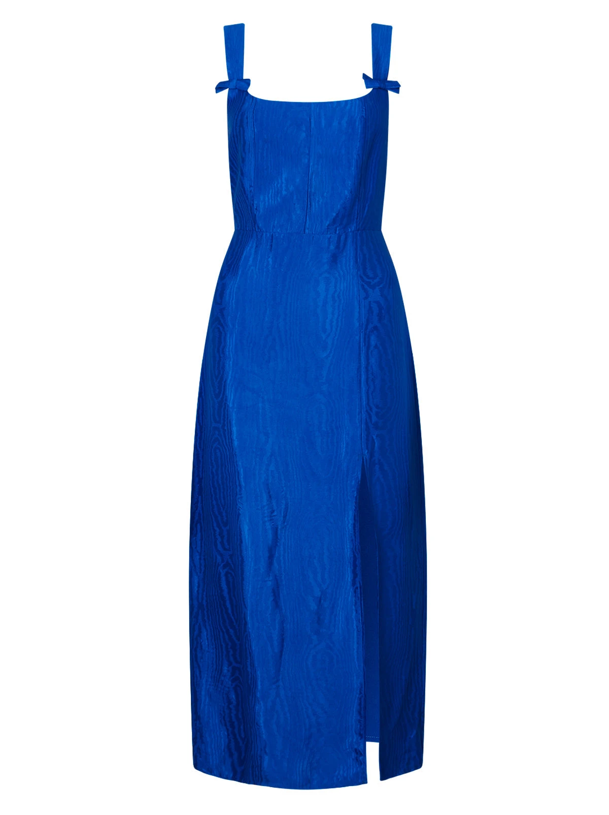 Sophisticated, but make it sultry. Rosalind is a midi-length dress with wide straps (perfect for bra straps, you’re welcome) cut from premium moiré fabric in rich Cobalt Blue. Her bow detailing keeps things sweet whilst her thigh-high split adds a little glamour. Wear her with a barely-there heel for a chic party look.
