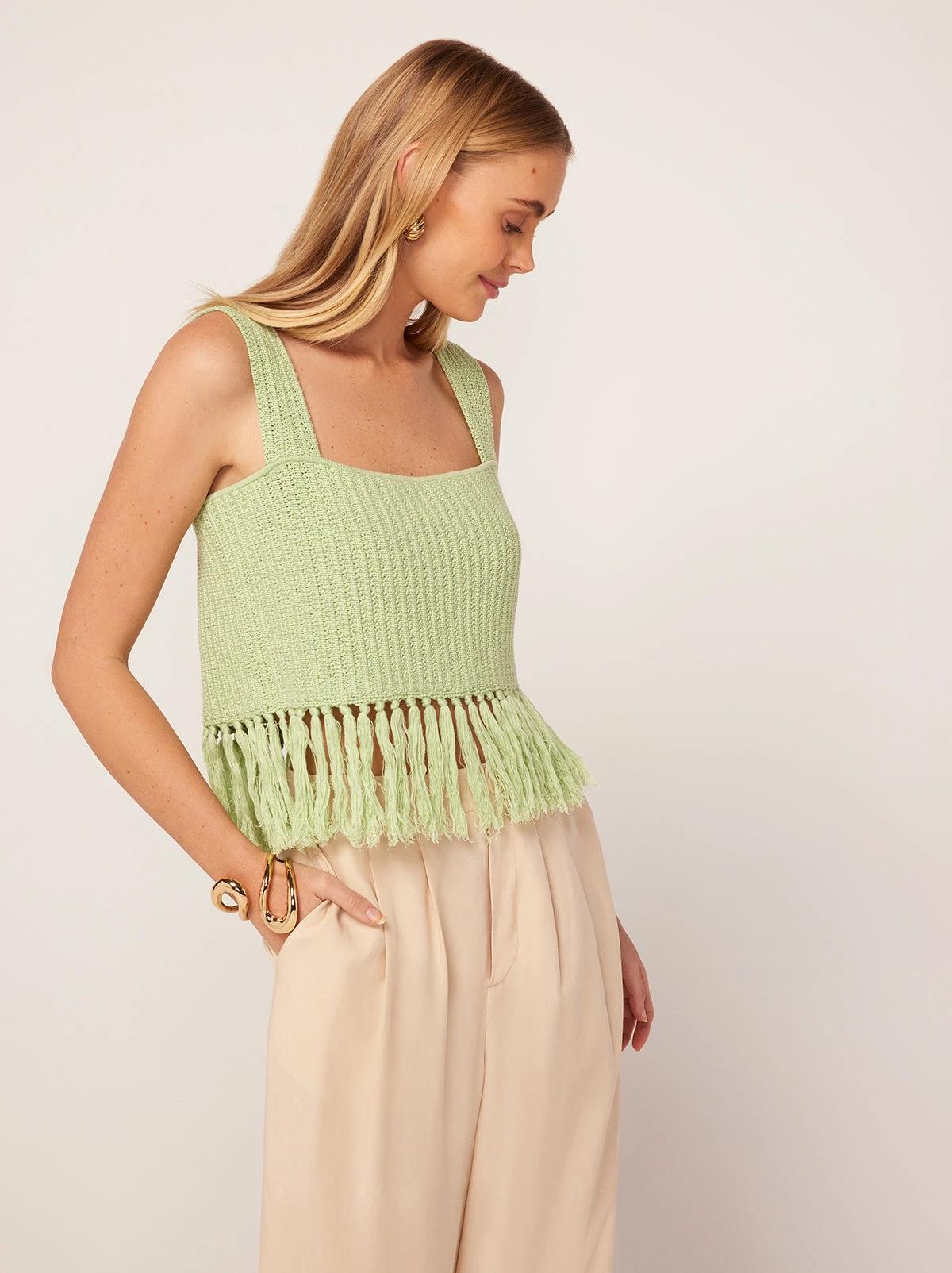 The understated statement. Roxanna is all about an easy, cropped fit with wide straps for comfort and crafted from soft cotton-bend crochet. Her hem fringing adds a touch of fancy and her sweet Pistachio hue makes her feel fresh for the new season.