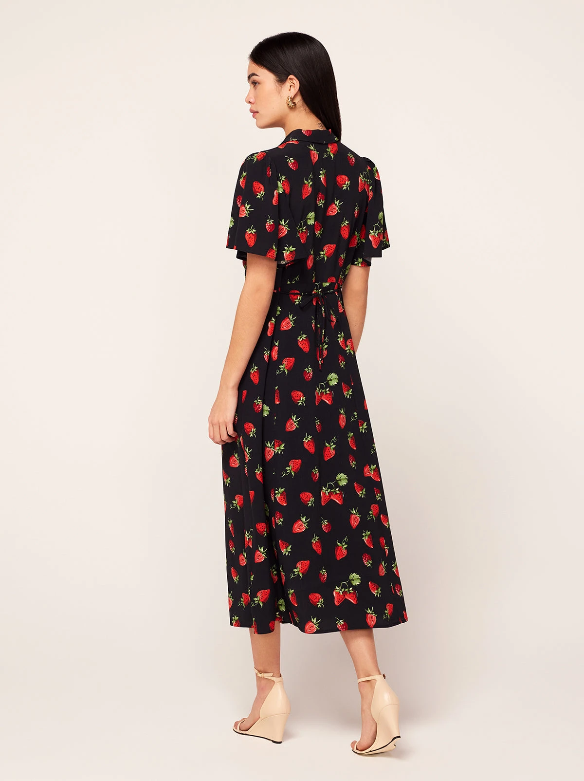 Throw-on-and-go is the motto. Sabina features adjustable waist ties for a closer fit. Her collar and flared sleeves keep things kitsch and her V-neck adds a twist. Wear her with trainers during the day and heels to dinner in the eve. Her in-house designed Berry print is also a KITRI Exclusive, so you won’t find her anywhere else!