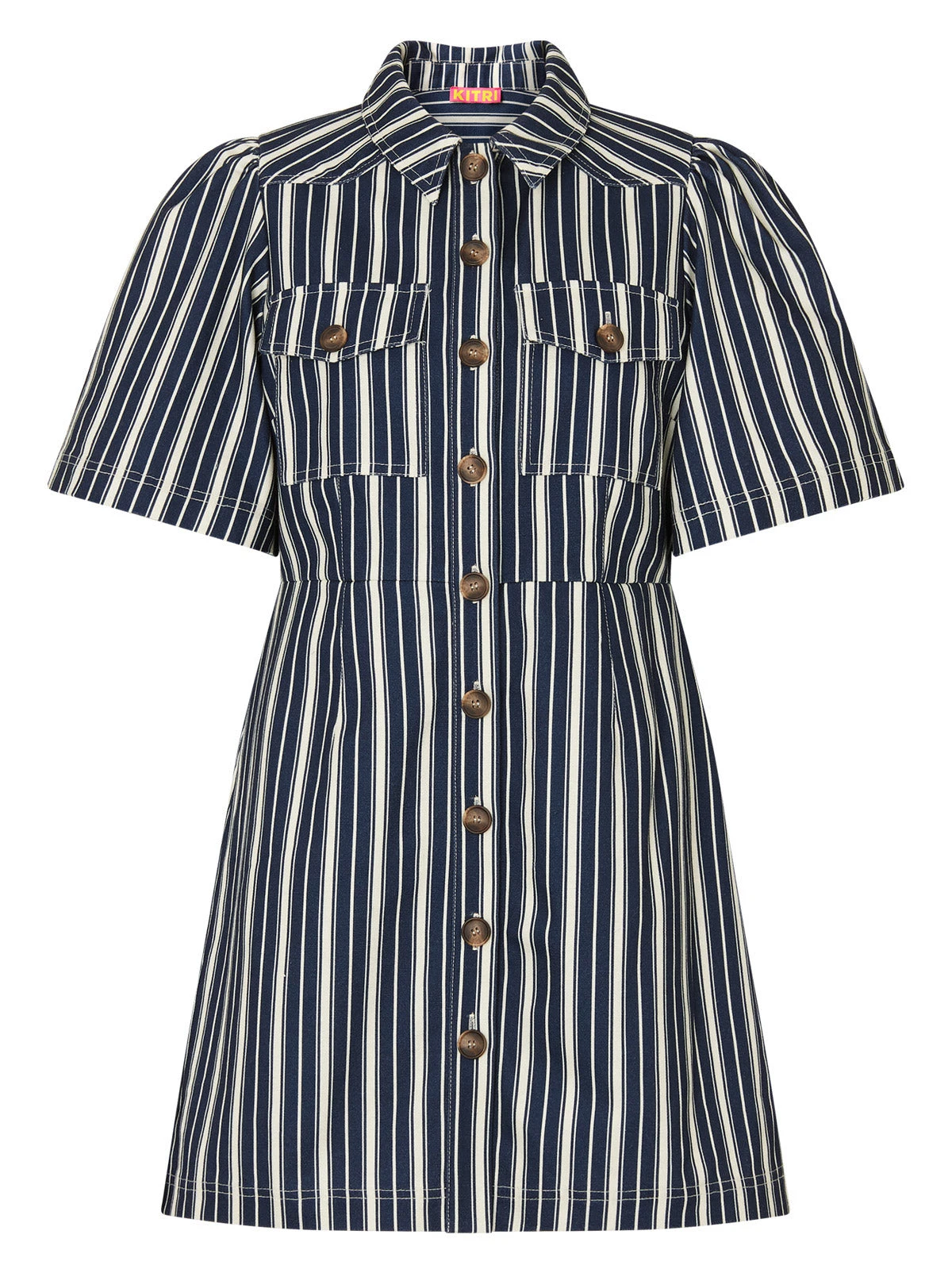 She’s cool. Shania is a mini dress with utility-inspired details, offset with feminine bell sleeves and an A-line skirt. Cut from mid-weight denim in retro blue stripe, she’ll look great with chunky loafers and socks now, or with knee-high boots during the cooler months.