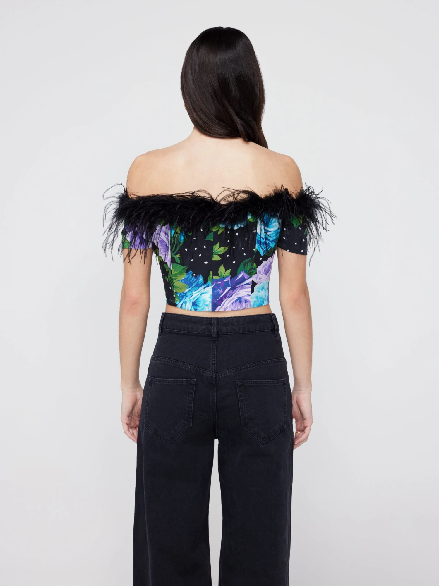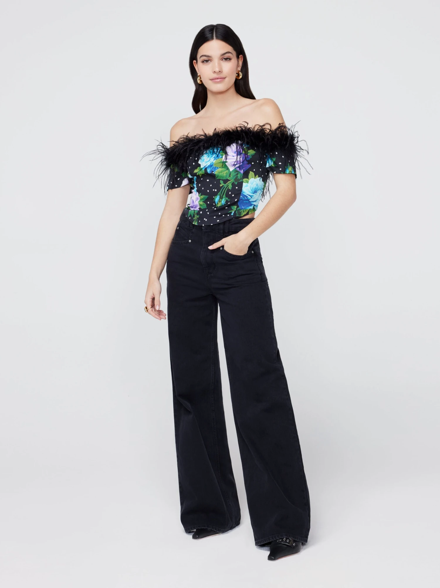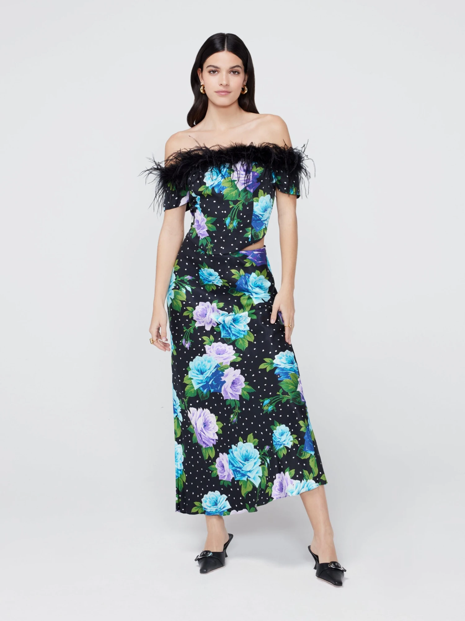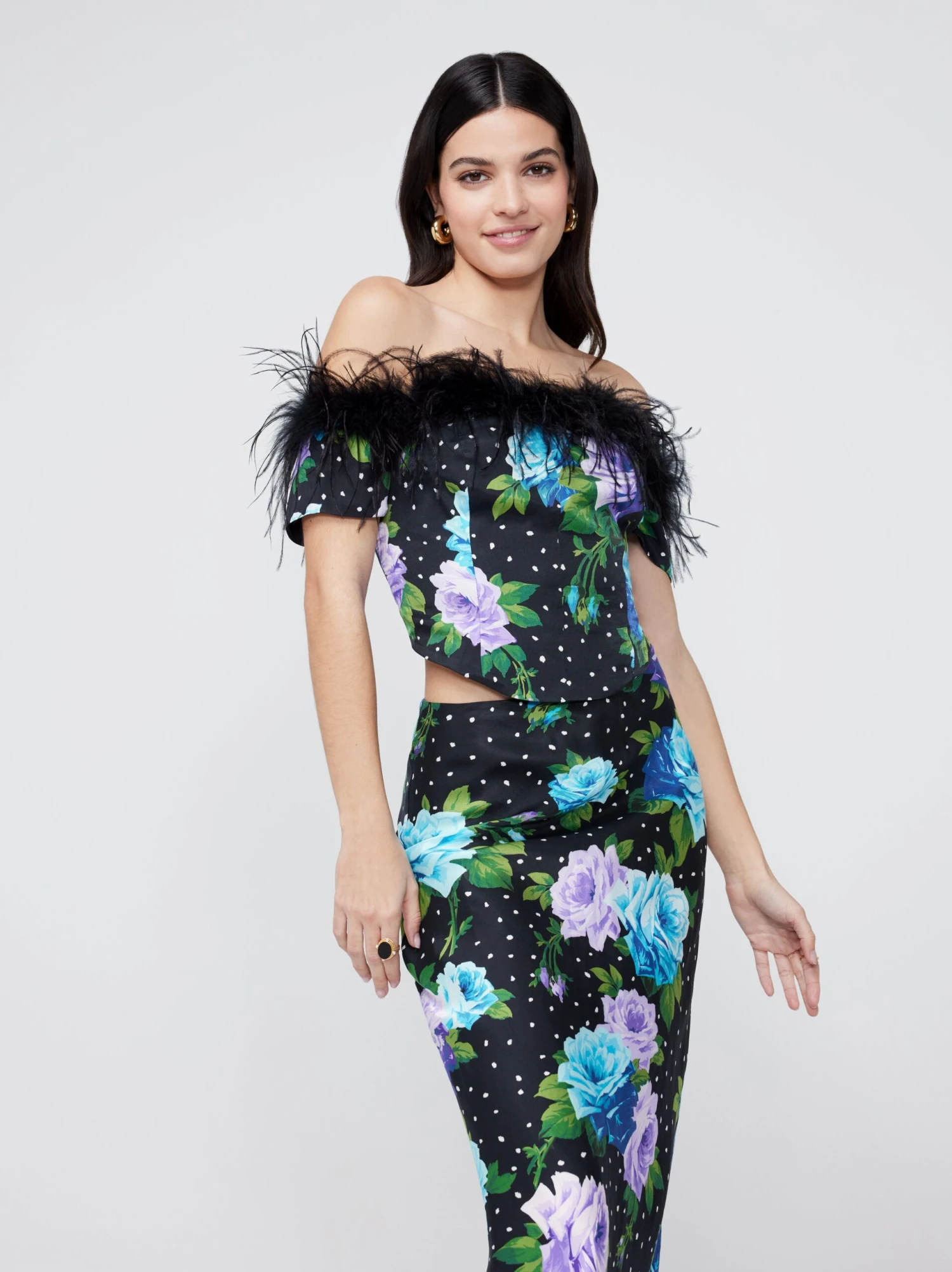 Comfortable corsetry? Yes, please. Sydney is a feather-trimmed bardot top who’s ready to transform your favourite jeans into the perfect party look. Her corset-inspired seams and cap sleeves are as flattering as they are chic. Pair her with matching Layla Blue Painted Rose Midi Skirt for the ultimate party two-piece.