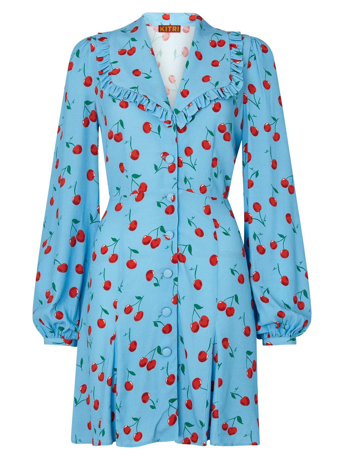 Fresh and playful. Tabitha’s oversized collar and flippy skirt add a hint of whimsy and her romantic, voluminous sleeves add a touch of fancy. Not to mention her juicy Blue Cherry print – tres jolie!