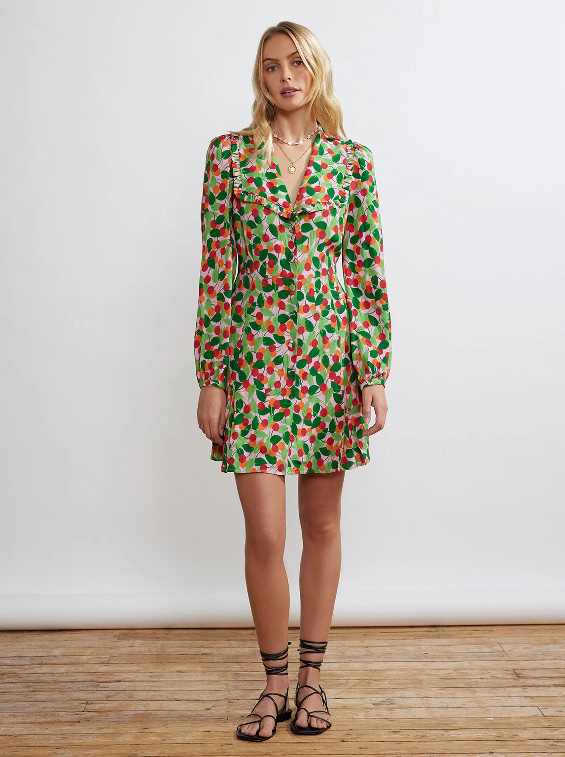 Fresh and playful. Tabitha’s oversized collar and flippy skirt add a hint of whimsy and her romantic, voluminous sleeves add a touch of fancy. Not to mention her juicy Multi Cherry print – tres jolie!