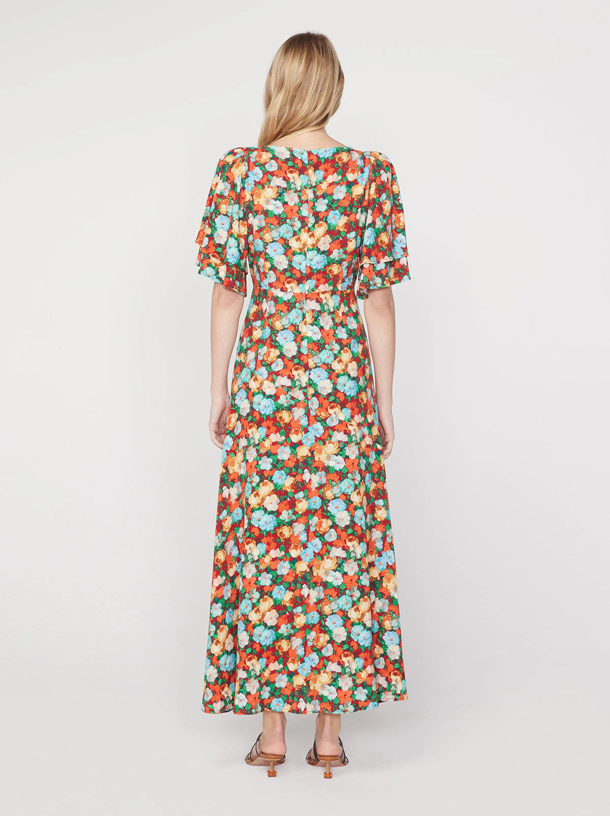 The painter’s muse. Tallulah exudes sartorial appeal with her tiered, angel sleeves and flirty v-neck. Her circle-cut flared skirt adds to her swishability and her Cezanne-inspired Blue Impressionist Floral print, hand-coloured in-house, keeps her feeling classic.