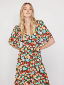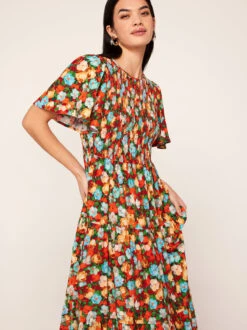 Wren is a shirred midi dress with romantic, voluminous sleeves finished with frills at the cuff. Flattering and comfortable, thanks to the shirring from neck to top hip releasing in a flowy midi skirt, Wren is the perfect elegant desk-to-dinner dress – just switch up your boots to heels.