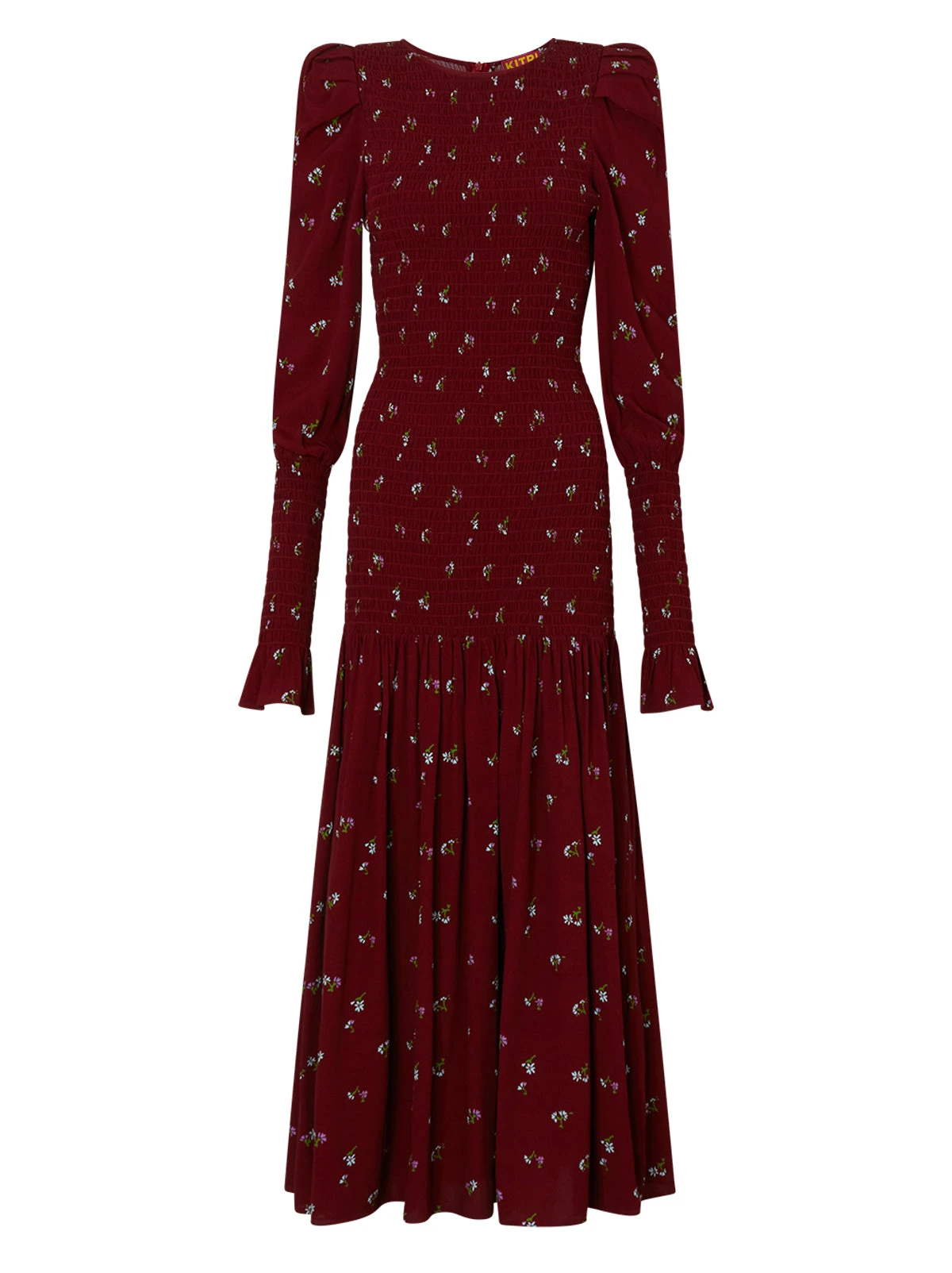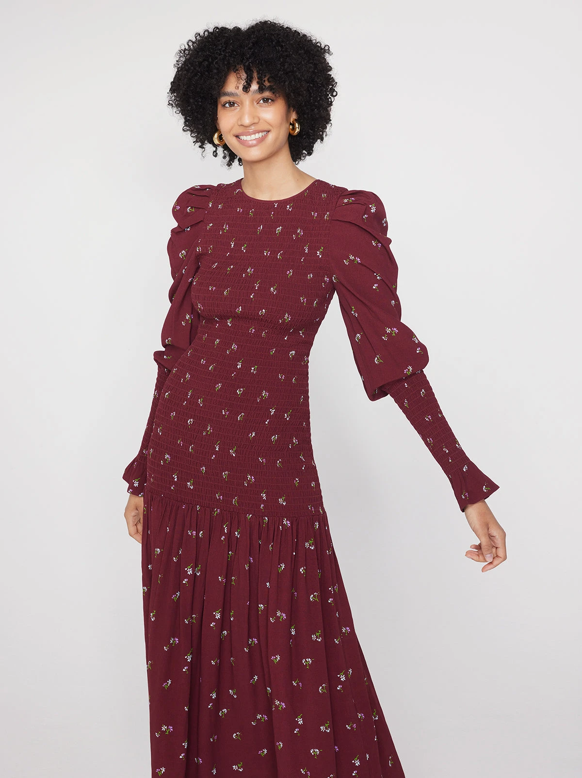Wren Berry Ditsy Floral Shirred Midi Dress